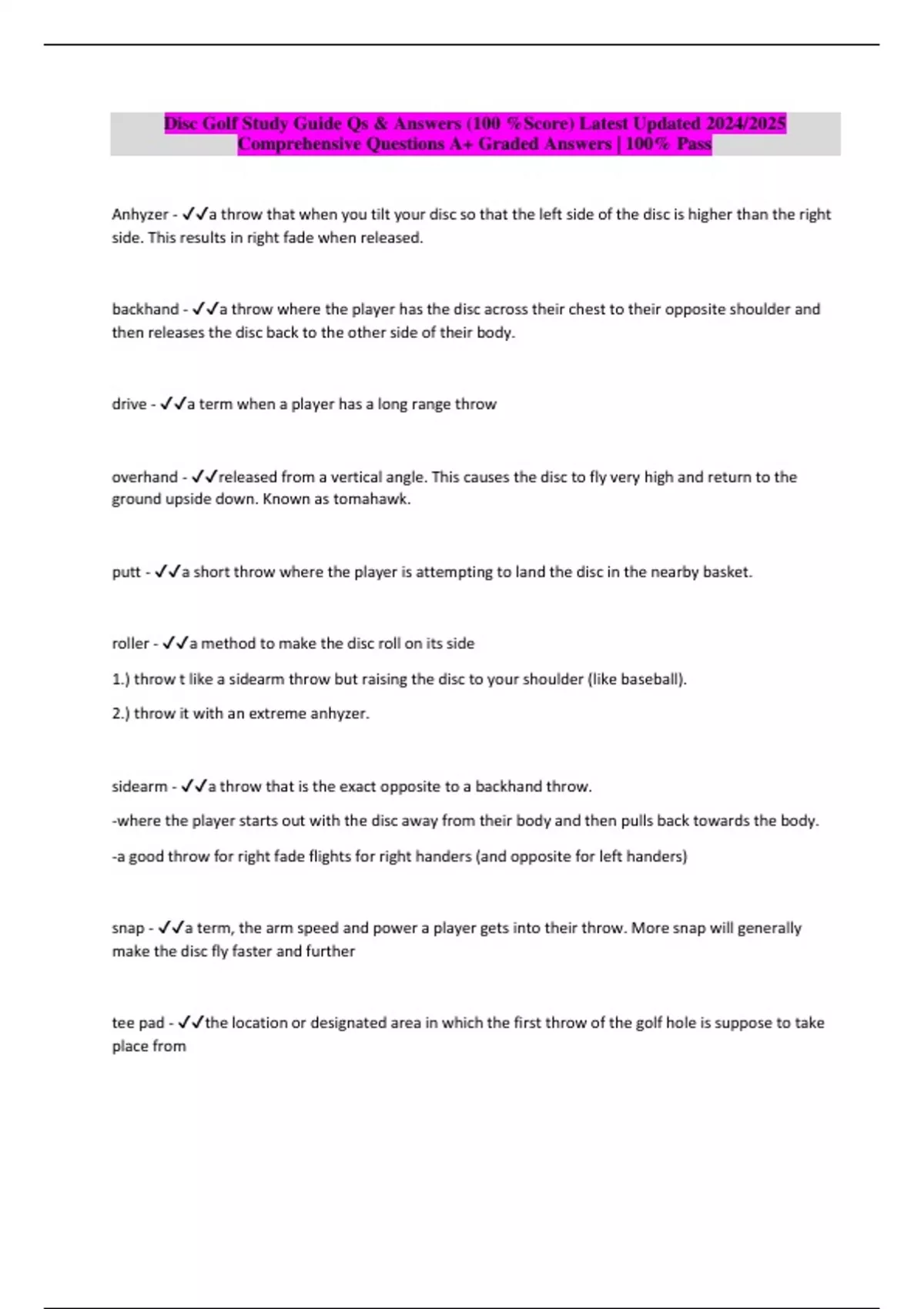 Disc Golf Study Guide Qs & Answers (100 %Score) Latest Updated 2024/2025 Comprehensive Questions A+ Graded Answers | 100% Pass
