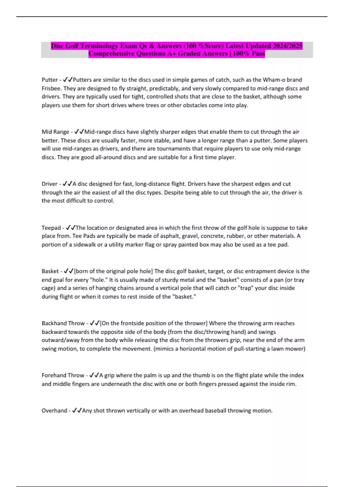 Disc Golf Terminology Exam Qs & Answers (100 %Score) Latest Updated 2024/2025 Comprehensive Questions A+ Graded Answers | 100% Pass