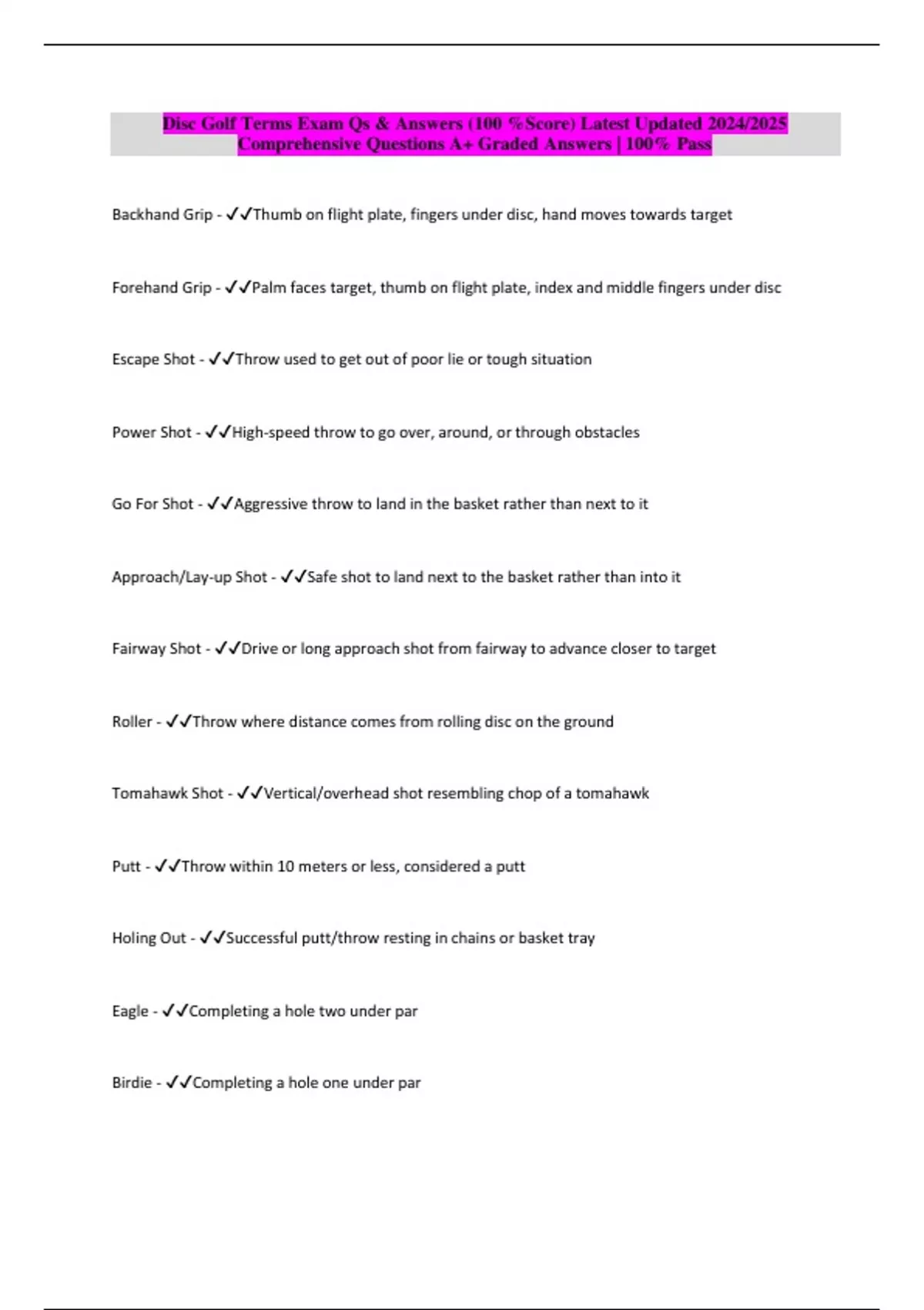 Disc Golf Terms Exam Qs & Answers (100 %Score) Latest Updated 2024/2025 Comprehensive Questions A+ Graded Answers | 100% Pass