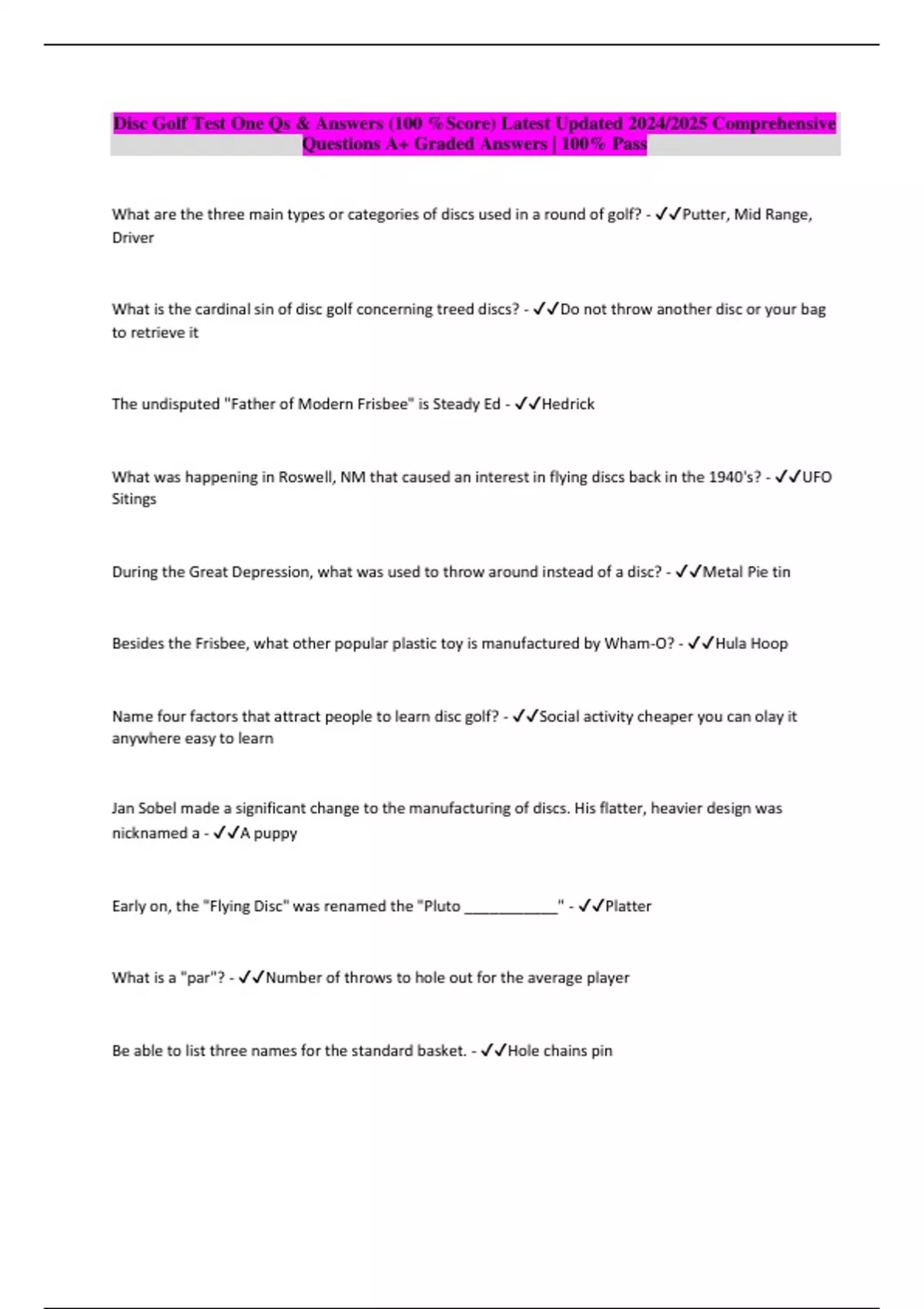 Package deal::: DISC GOLF Exams Qs & Answers (100 %Score) Latest updated 2024/2025 Comprehensive Questions A+ Graded Answers | 100% Pass