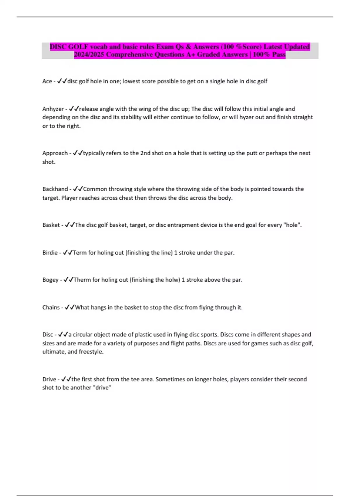 Package deal::: DISC GOLF Exams Qs & Answers (100 %Score) Latest updated 2024/2025 Comprehensive Questions A+ Graded Answers | 100% Pass