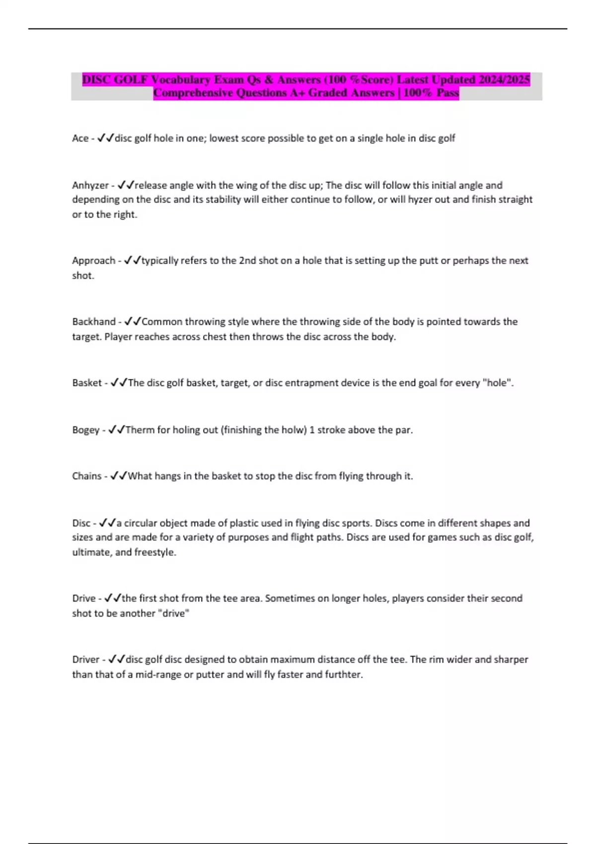 DISC GOLF Vocabulary Exam Qs & Answers (100 %Score) Latest Updated 2024/2025 Comprehensive Questions A+ Graded Answers | 100% Pass