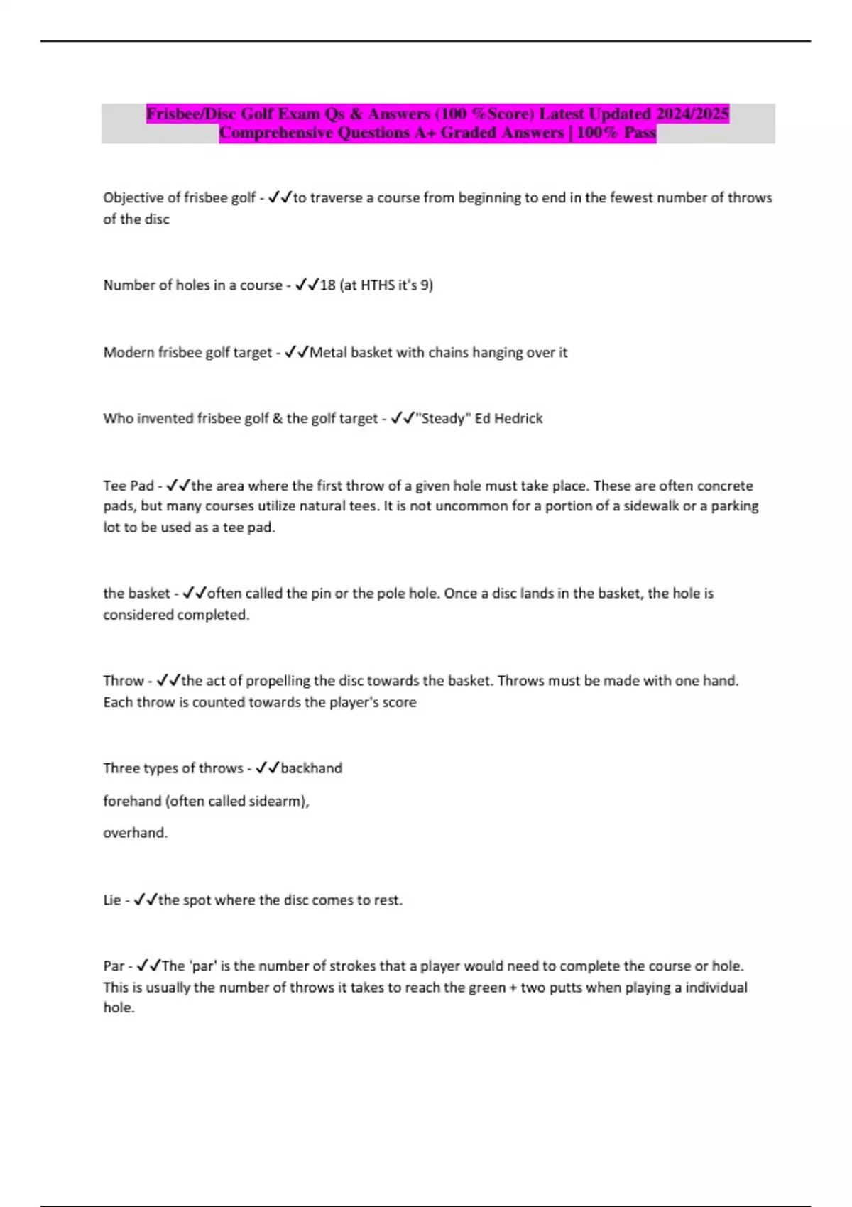 Frisbee/Disc Golf Exam Qs & Answers (100 %Score) Latest Updated 2024/2025 Comprehensive Questions A+ Graded Answers | 100% Pass