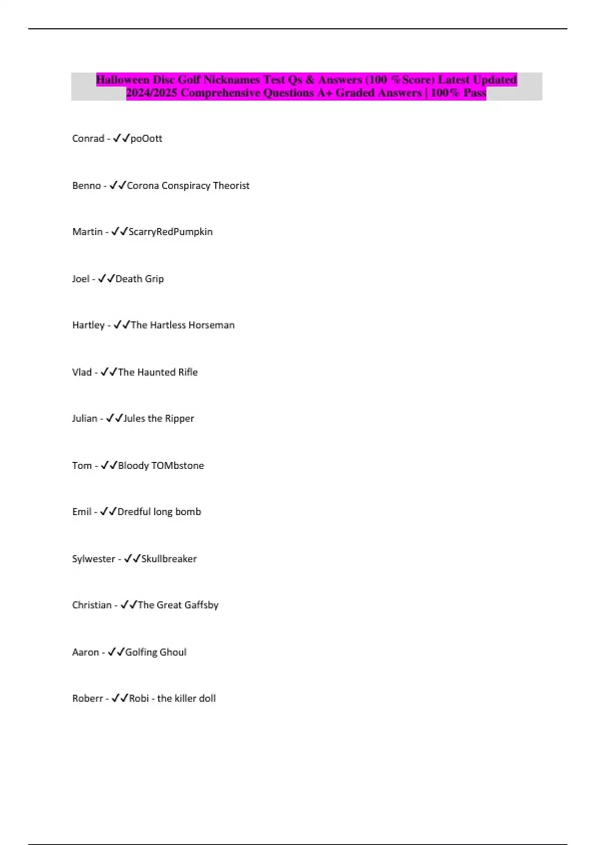 Halloween Disc Golf Nicknames Test Qs & Answers (100 %Score) Latest Updated 2024/2025 Comprehensive Questions A+ Graded Answers | 100% Pass