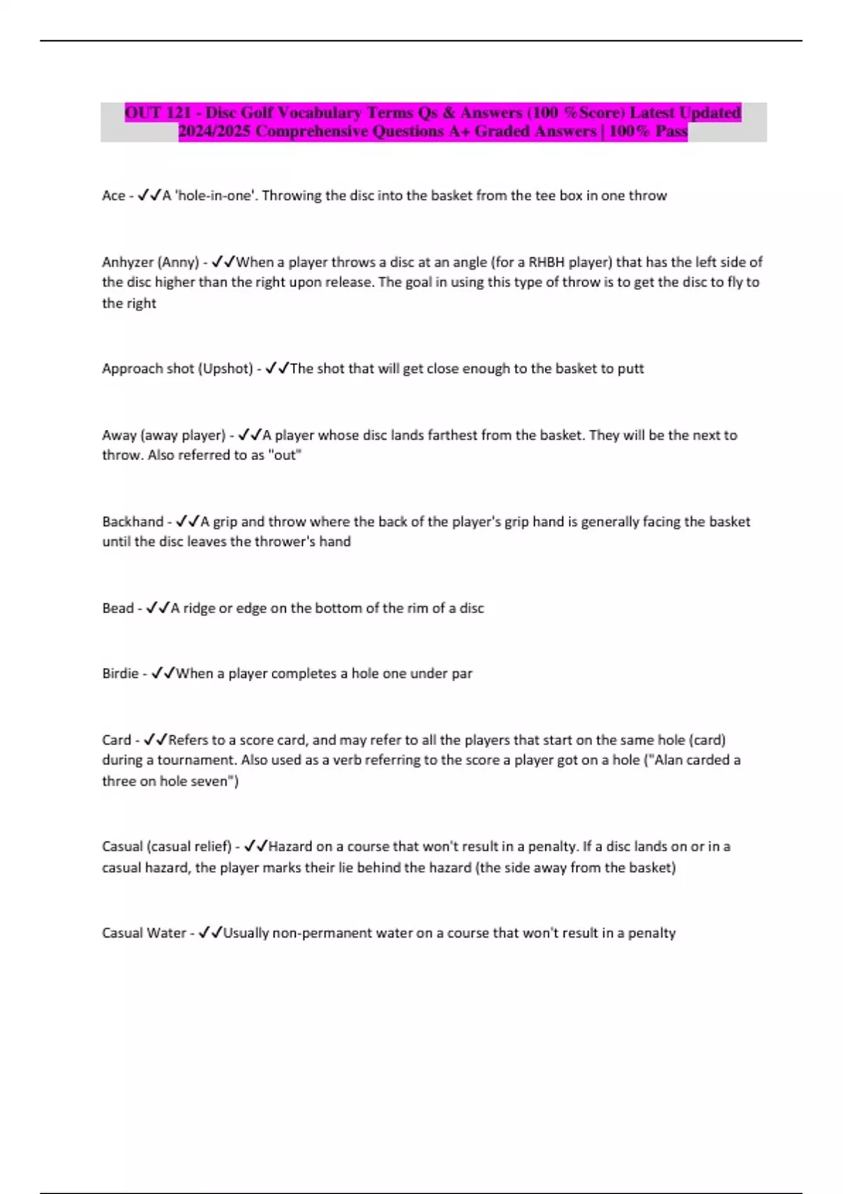 OUT 121 - Disc Golf Vocabulary Terms Qs & Answers (100 %Score) Latest Updated 2024/2025 Comprehensive Questions A+ Graded Answers | 100% Pass