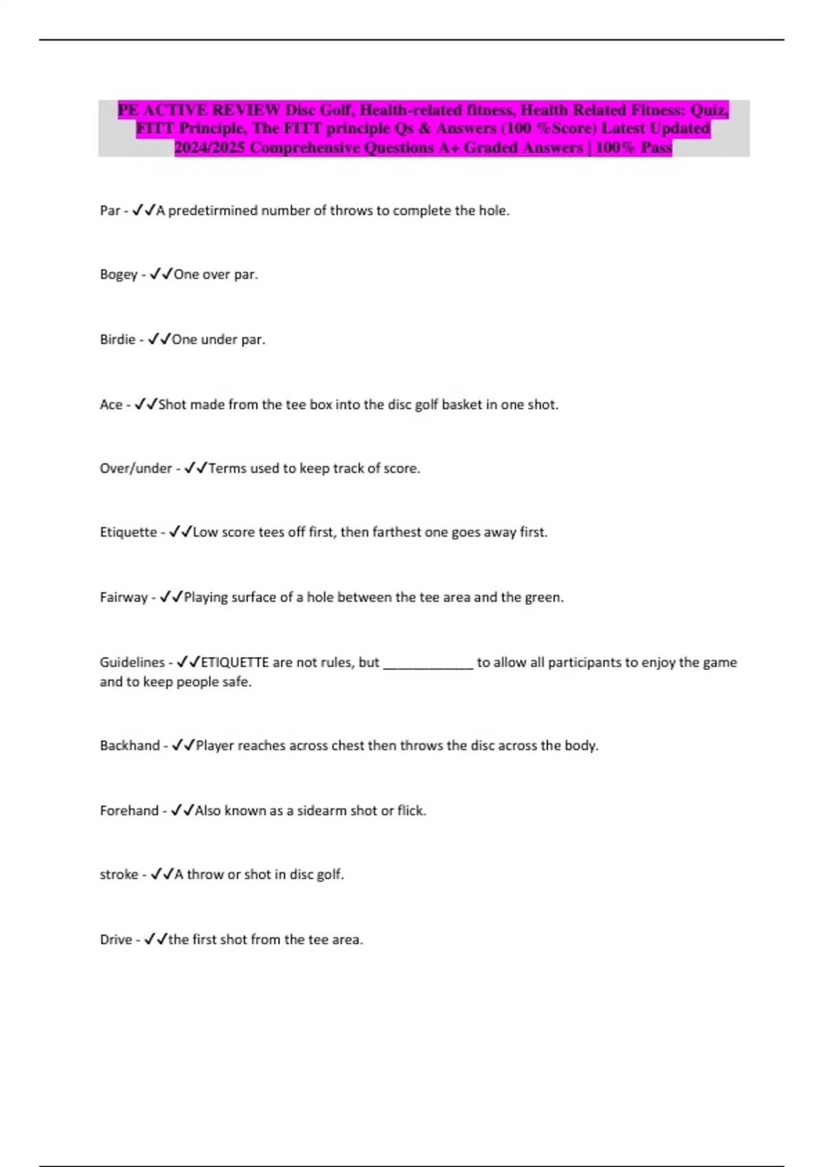 PE ACTIVE REVIEW Disc Golf, Health-related fitness, Health Related Fitness: Quiz, FITT Principle, The FITT principle Qs & Answers (100 %Score) Latest Updated 2024/2025 Comprehensive Questions A+ Graded Answers | 100% Pass