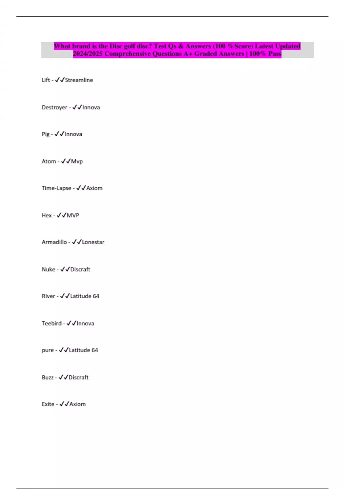 What brand is the Disc golf disc? Test Qs & Answers (100 %Score) Latest Updated 2024/2025 Comprehensive Questions A+ Graded Answers | 100% Pass
