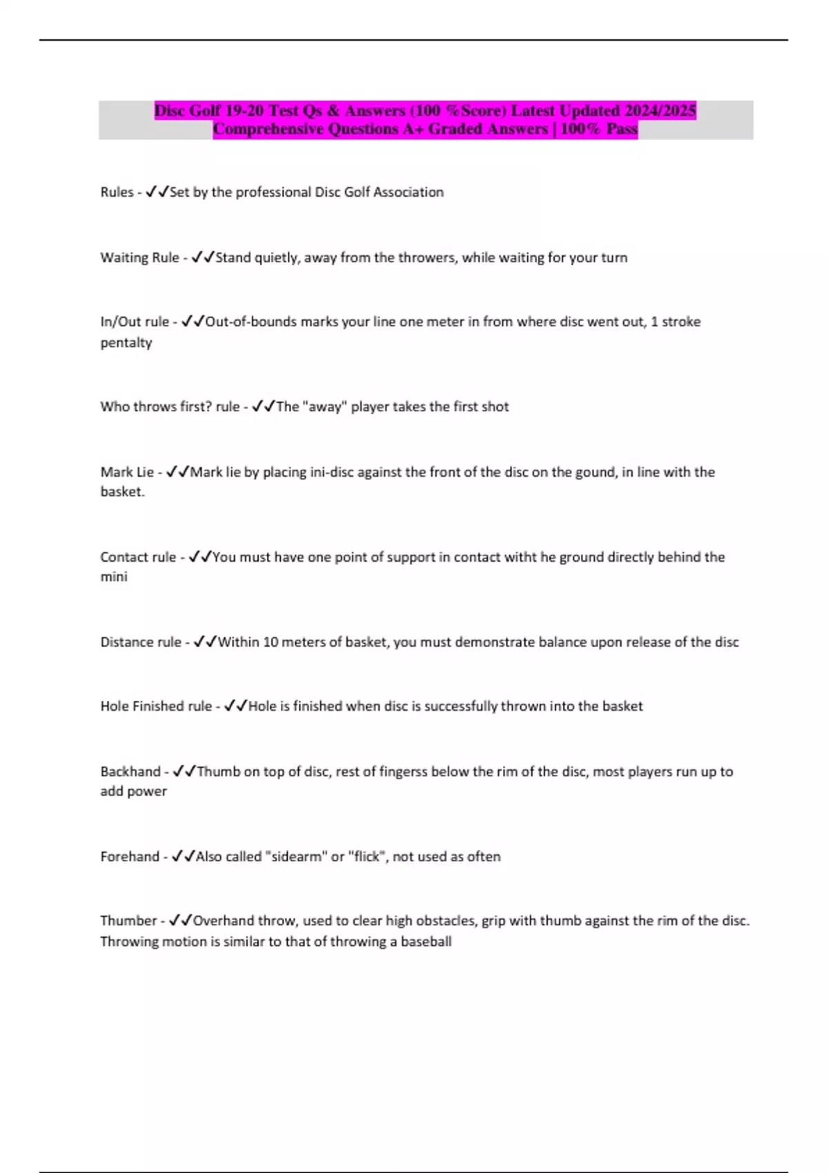 Disc Golf 19-20 Test Qs & Answers (100 %Score) Latest Updated 2024/2025 Comprehensive Questions A+ Graded Answers | 100% Pass