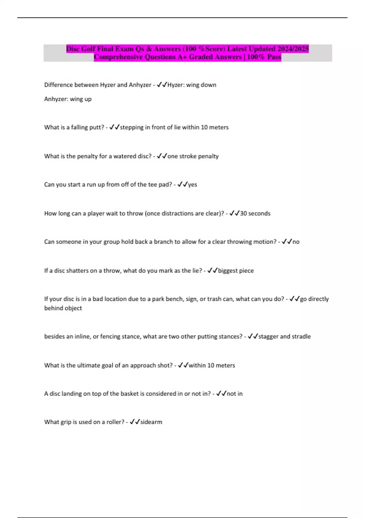 Package deal::: DISC GOLF Exams Qs & Answers (100 %Score) Latest updated 2024/2025 Comprehensive Questions A+ Graded Answers | 100% Pass
