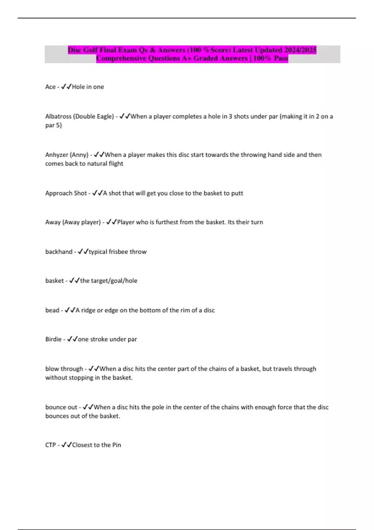 Package deal::: DISC GOLF Exams Qs & Answers (100 %Score) Latest updated 2024/2025 Comprehensive Questions A+ Graded Answers | 100% Pass