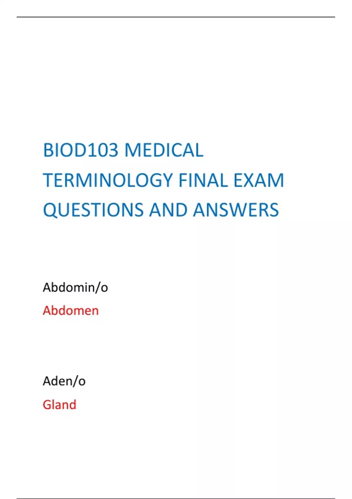 BIOD103 MEDICAL TERMINOLOGY FINAL EXAM QUESTIONS AND ANSWERS