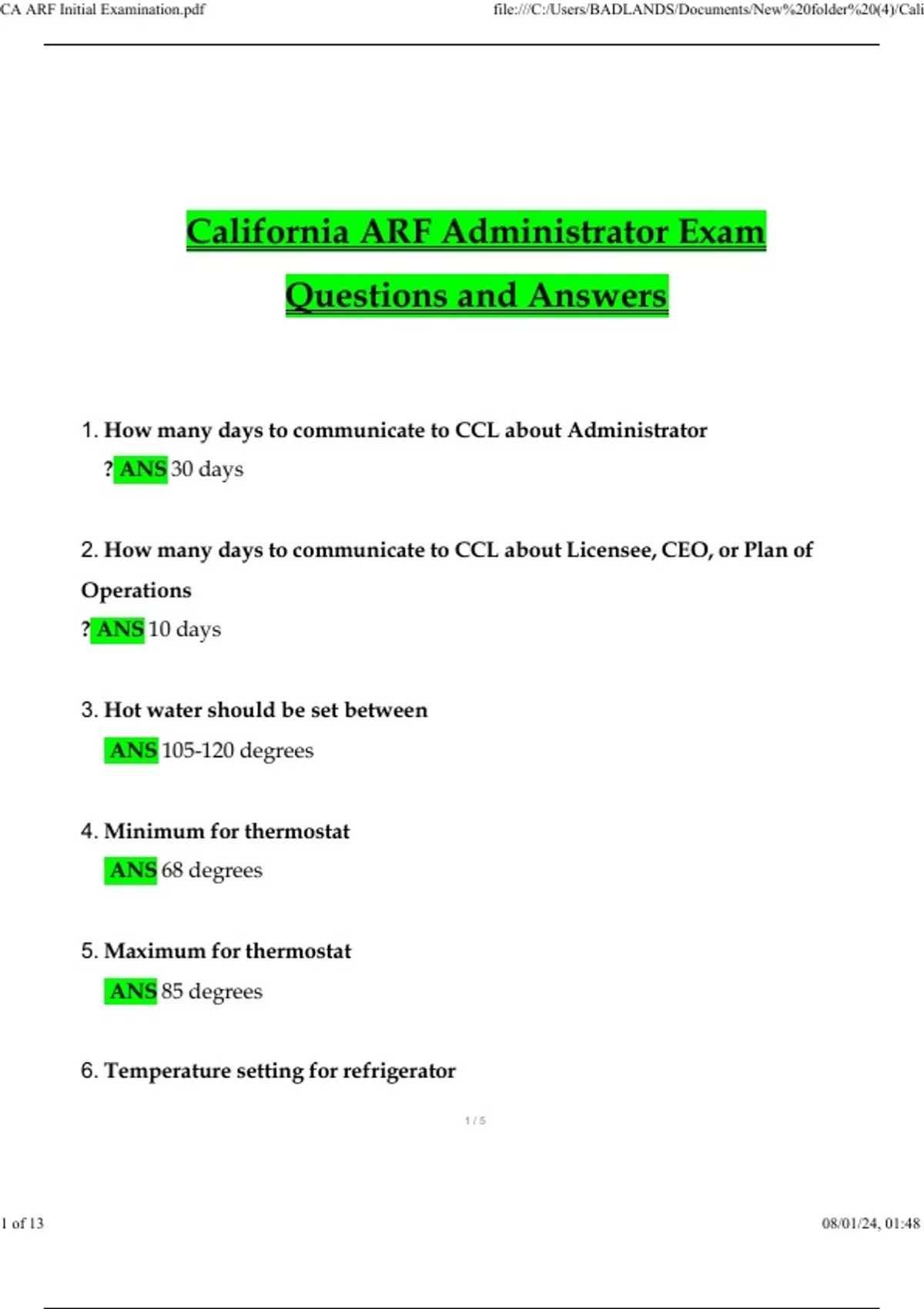 California ARF Administrator Exam Questions and Answers Updated (Verified Answers)