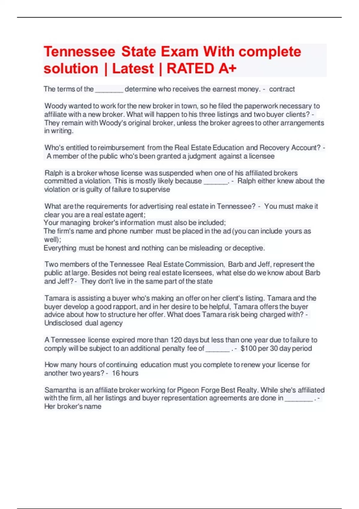 Tennessee State Exam With complete solution | Latest | RATED A+