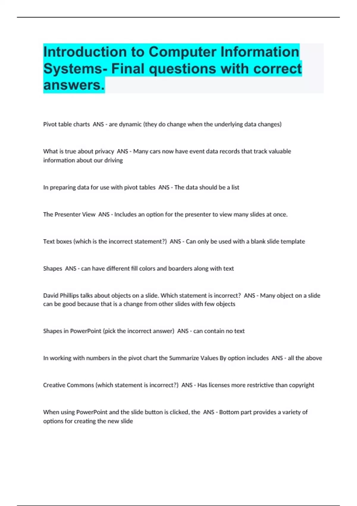 Introduction to Computer Information Systems- Final questions with correct answers.