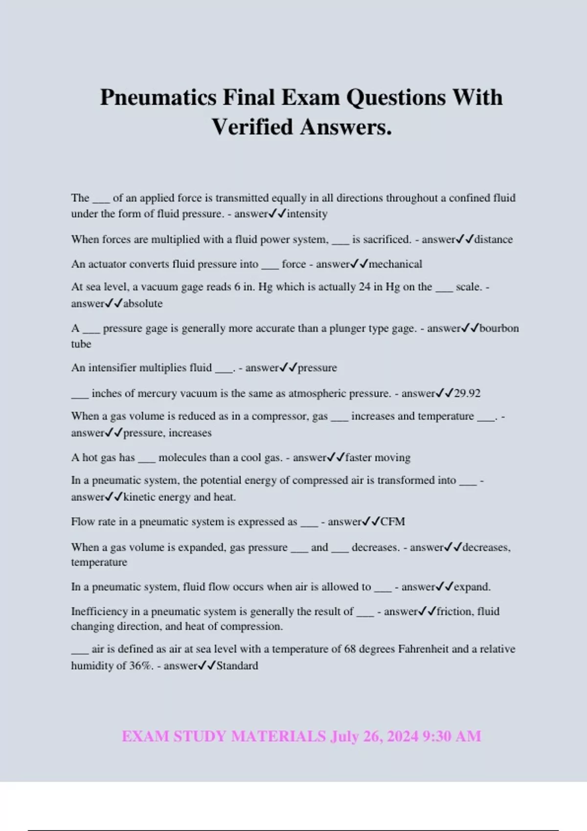 Pneumatics Final Exam Questions With Verified Answers