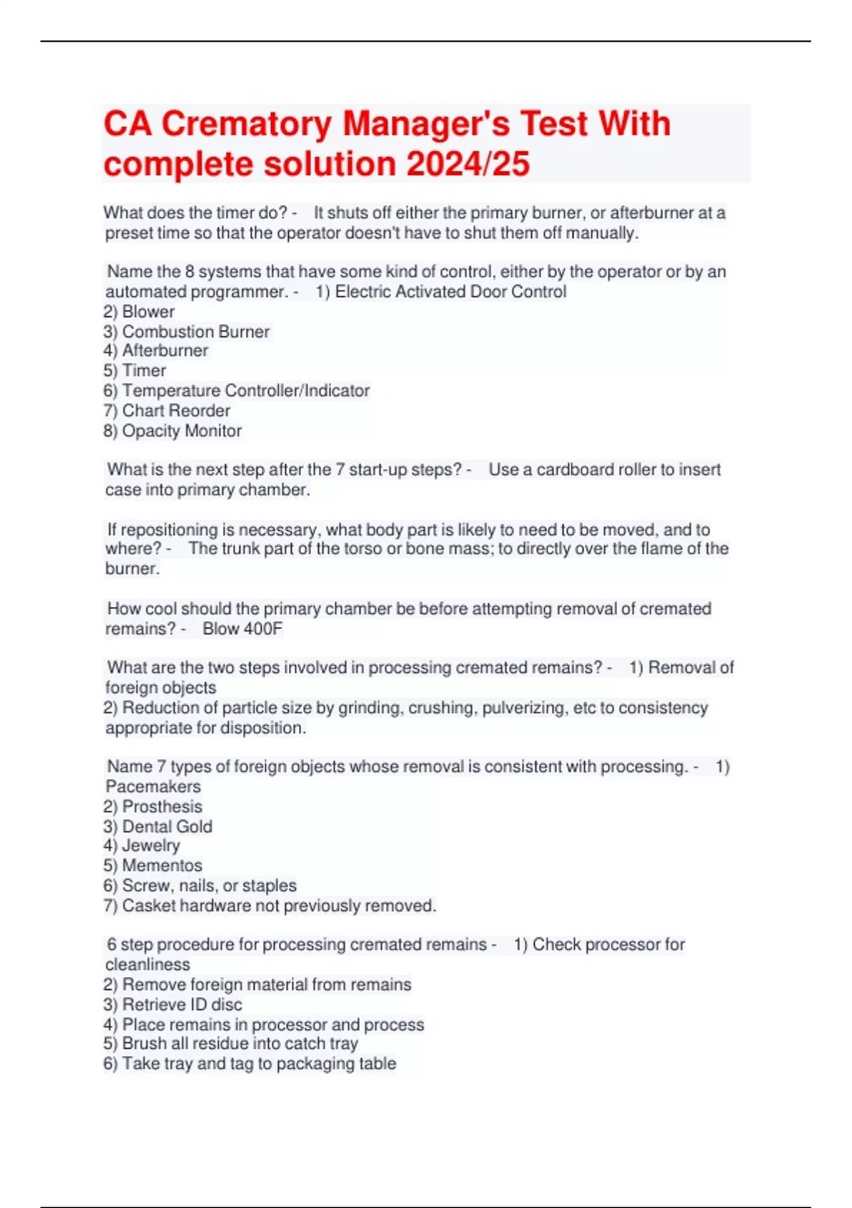 CA Crematory Manager's Test With complete soluti on 2024/25 What jjdoes jjthe jjtimer jjdo? jj- jj jj jj jjIt jjshuts jjoff jjeither jjthe jjprimary jjburner, jjor jjafterburner jjat jja jjpreset jjtime jjso jjthat jjthe jjoperator jjdoesn't jjhave jjto jjshut jjthem jjoff jjmanually. jjName jjthe jj8 jjsystems jjthat jjhave jjsome jjkind jjof jjcontrol, jjeither jjby jjthe jjoperator jjor jjby jjan jjautomated jjprogrammer. jj- jj jj jj jj1) jjElectric jjActivated jjDoor jjControl 2) jjBlower 3) jjCombustion jjBurner jj 4) jjAfterburner jj 5) jjTimer 6) jjTemperature jjController/Indicator 7) jjChart jjReorder 8) jjOpacity jjMonitor jjWhat jjis jjthe jjnext jjstep jjafter jjthe jj7 jjstart-up jjsteps? jj- jj jj jj jjUse jja jjcardboard jjroller jjto jjinsert jjcase jjinto jjprimary jjchamber. jjIf jjrepositioning jjis jjnecessary, jjwhat jjbody jjpart jjis jjlikely jjto jjneed jjto jjbe jjmoved, jjand jjto jjwhere? jj- jj jj jj jjThe jjtrunk jjpart jjof jjthe jjtorso jjor jjbone jjmass; jjto jjdirectly jjover jjthe jjflame jjof jjthe jjburner. jjHow jjcool jjshould jjthe jjprimary jjchamber jjbe jjbefore jjattempting jjremoval jjof jjcremated jjremains? jj- jj jj jj jjBlow jj400F jjWhat jjare jjthe jjtwo jjsteps jjinvolved jjin jjprocessing jjcremated jjremains? jj- jj jj jj jj1) jjRemoval jjof jjforeign jjobjects 2) jjReduction jjof jjparticle jjsize jjby jjgrinding, jjcrushing, jjpulverizing, jjetc jjto jjconsistency jjappropriate jjfor jjdisposition. jjName jj7 jjtypes jjof jjforeign jjobjects jjwhose jjremoval jjis jjconsistent jjwith jjprocessing. jj- jj jj jj jj1) jjPacemakers 2) jjProsthesis 3) jjDental jjGold 4) jjJewelry 5) jjMementos 6) jjScrew, jjnails, jjor jjstaples 7) jjCasket jjhardware jjnot jjpreviously jjremoved. jj6 jjstep jjprocedure jjfor jjprocessing jjcremated jjremains jj- jj jj jj jj1) jjCheck jjprocessor jjfor jjcleanliness 2) jjRemove jjforeign jjmaterial jjfrom jjremains 3) jjRetrieve jjID jjdisc 4) jjPlace jjremains jjin jjprocessor jjand jjprocess 5) jjBrush jjall jjresidue jjinto jjcatch jjtray 6) jjTake jjtray jjand jjtag jjto jjpackaging jjtable jjMinimum jjthickness jjof jjplastic jjbag jjinside jjurn. jj- jj jj jj jj2 jjmm jjWhere jjin jjurn jjshould jjID jjdisc jjbe jjplaced? jj- jj jj jj jjOn jjplastic jjtie jjthat jjcloses jjbag jjinside. jjWhat jjshould jjbe jjdone jjif jjcremated jjremains jjdo jjnot jjfill jjurn jjcompletely? jj- jj jj jj jjFill jjthe jjbalance jjwith jjclean jjshredded jjpaper. jjIf jjurn jjlid jjis jjnot jjcompletely jjsecure, jjwhat jjshould jjbe jjsured jjto jjsecure jjit? jj- jj jj jj jjNylon jjfilament jjtape. jjList jjeight jjlayers jjof jjmaterial jjfor jjpackaged jjcremated jjremains, jjfrom jjinside jjto jjoutside. jj- jj jj jj jj1) jjCremated jjremains 2) jjPlastic jjbag 3) jjIdentification jjdisc 4) jjUrn 5) jjIdentification jjLabel 6) jjShipping jjBox 7) jjWhite jjPaper 8) jjIdentification jjLabel jjDefine jjovershooting. jj- jj jj jj jjExcessive jjrapid jjcombustion. jjMost jjcommon jjcause jjof jjovershooting. jj- jj jj jj jjInteresting jjan jjobese jjcase jjin jja jjhot jjcremator. jjWhat jjhappens jjwhen jjcremator jjgoes jjpositive? jj- jj jj jj jjExcess jjfuel, jjusually jjfrom jjbody jjfat jjof jjobese jjcase, jjtravels jjto jjstack jjfor jjmore jjO2, jjand jjflames jjcan jjbe jjseen jjexiting jjthe jjstack. jjOther jjthan jjobese jjcases, jjname jjtwo jjpossible jjcauses jjof jjovershooting. jj- jj jj jj jj1) jjLacquered jjor jjvarnished jjcaskets. 2) jjBurner jjout jjof jjcalibration. jjIf jja jjcrematory jjplans jjto jjhold jjan jjuncremated jjbody jjfor jjmore jjthan jj24 jjhours, jjhow jjsoon jjmust jjit jjbe jjrefrigerated, jjand jjat jjwhat jjtemperature? jj- jj jj jj jjWithin jj2 jjhours jjof jjreceipt, jjat jjtemperature jjof jj50F jjor jjlower. jjWhen jjmust jja jjcrematory jjoperator jjprovide jja jjprice jjlist? jj- jj jj jj jjAnytime jjany jjperson jjinquires jjin-person. jjWhat jj5 jjthings jjmust jjbe jjon jjany jjcrematory jjprice jjlist? jj- jj jj jj jj1) jjPrice jjfor jjcremation 2) jjPrice jjfor jjstorage. 3) jjPrices jjof jjcremation jjcontainers. 4) jjPrices jjof jjcremated jjremains jjcontainers jjand/or jjurns. jj 5) jjRequirements jjfor jjcremation jjcontainers. jjIs jjit jjnecessary jjto jjprovide jjcremation jjpricing jjinformation jjover jjthe jjphone jjwhen jjrequested? jj- jj jj jj jjYes. jjMinimally, jjwritten jjprice jjinformation jjmust jjidentify jjthe jjcrematorium, jjas jjwell jjat jjthe jjcurrent jjaddress jjand jjphone jjnumber jjof jj______________. jj- jj jj jj jjThe jjcemetery jjboard, jjin jj8pt jjboldface jjtype jjor jjlarger.