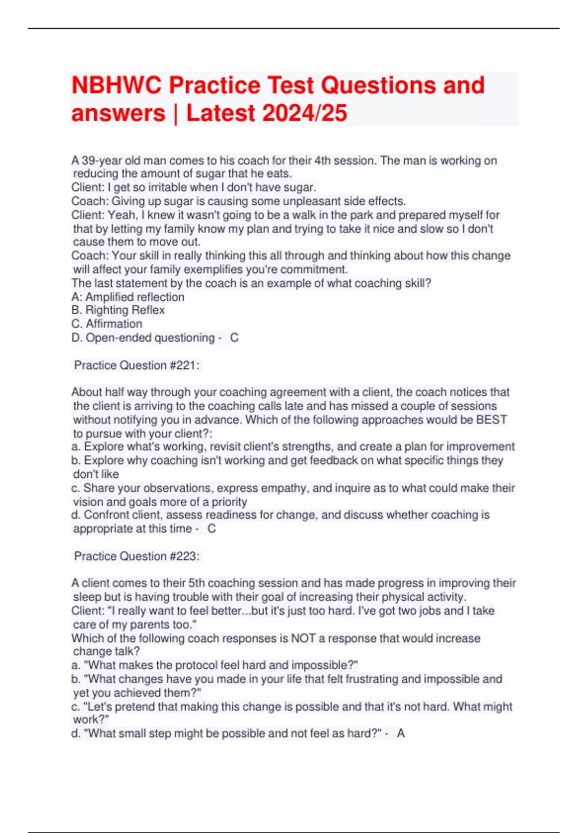NBHWC Practice Test Questions and answers | Latest 2024/25 A iii39-year iiiold iiiman iiicomes iiito iiihis iiicoach iiifor iiitheir iii4th iiisession. iiiThe iiiman iiiis iiiworking iiion iiireducing iiithe iiiamount iiiof iiisugar iiithat iiihe iiieats. Client: iiiI iiiget iiiso iiiirritable iiiwhen iiiI iiidon't iiihave iiisugar. Coach: iiiGiving iiiup iiisugar iiiis iiicausing iiisome iiiunpleasant iiiside iiieffects. Client: iiiYeah, iiiI iiiknew iiiit iiiwasn't iiigoing iiito iiibe iiia iiiwalk iiiin iiithe iiipark iiiand iiiprepared iiimyself iiifor iiithat iiiby iiiletting iiimy iiifamily iiiknow iiimy iiiplan iiiand iiitrying iiito iiitake iiiit iiinice iiiand iiislow iiiso iiiI iiidon't iiicause iiithem iiito iiimove iiiout. Coach: iiiYour iiiskill iiiin iiireally iiithinking iiithis iiiall iiithrough iiiand iiithinking iiiabout iiihow iiithis iiichange iiiwill iiiaffect iiiyour iiifamily iiiexemplifies iiiyou're iiicommitment. The iiilast iiistatement iiiby iiithe iiicoach iiiis iiian iiiexample iiiof iiiwhat iiicoaching iiiskill? A: iiiAmplified iiireflection B. iiiRighting iiiReflex C. iiiAffirmation D. iiiOpen -ended iiiquestioning iii- iii iii iiiC iiiPractice iiiQuestion iii#221: iii About iiihalf iiiway iiithrough iiiyour iiicoaching iiiagreement iiiwith iiia iiiclient, iiithe iiicoach iiinotices iiithat iiithe iiiclient iiiis iiiarriving iiito iiithe iiicoaching iiicalls iiilate iiiand iiihas iiimissed iiia iiicouple iiiof iiisessions iiiwithout iiinotifying iiiyou iiiin iiiadvance. iiiWhich iiiof iiithe iiifollowing iiiapproaches iiiwould iiibe iiiBEST iiito iiipursue iiiwith iiiyour iiiclient?: a. iiiExplore iiiwhat's iiiworking, iiirevisit iiiclient's iiistrengths, iiiand iiicreate iiia iiiplan iiifor iiiimprovement b. iiiExplore iiiwhy iiicoaching iiiisn't iiiworking iiiand iiiget iiifeedback iiion iiiwhat iiispecific iiithings iiithey iiidon't iiilike c. iiiShare iiiyour iiiobservations, iiiexpress iiiempathy, iiiand iiiinquire iiias iiito iiiwhat iiicould iiimake iiitheir iiivision iiiand iiigoals iiimore iiiof iiia iiipriority d. iiiConfront iiiclient, iiiassess iiireadiness iiifor iiichange, iiiand iiidiscuss iiiwhether iiicoaching iiiis iiiappropriate iiiat iiithis iiitime iii- iii iii iiiC iiiPractice iiiQuestion iii#223: iii A iiiclient iiicomes iiito iiitheir iii5th iiicoaching iiisession iiiand iiihas iiimade iiiprogress iiiin iiiimproving iiitheir iiisleep iiibut iiiis iiihaving iiitrouble iiiwith iiitheir iiigoal iiiof iiiincreasing iiitheir iiiphysical iiiactivity. Client: iii"I iiireally iiiwant iiito iiifeel iiibetter...but iiiit's iiijust iiitoo iiihard. iiiI've iiigot iiitwo iiijobs iiiand iiiI iiitake iiicare iiiof iiimy iiiparents iiitoo." Which iiiof iiithe iiifollowing iiicoach iiiresponses iiiis iiiNOT iiia iiiresponse iiithat iiiwould iiiincrease iiichange iiitalk? a. iii"What iiimakes iiithe iiiprotocol iiifeel iiihard iiiand iiiimpossible?" b. iii"What iiichanges iiihave iiiyou iiimade iiiin iiiyour iiilife iiithat iiifelt iiifrustrating iiiand iiiimpossible iiiand iiiyet iiiyou iiiachieved iiithem?" c. iii"Let's iiipretend iiithat iiimaking iiithis iiichange iiiis iiipossible iiiand iiithat iiiit's iiinot iiihard. iiiWhat iiimight iiiwork?" d. iii"What iiismall iiistep iiimight iiibe iiipossible iiiand iiinot iiifeel iiias iiihard?" iii- iii iii iiiA iiiPractice iiiQuestion iii#224: iii Which iiiof iiithe iiifollowing iiiis iiirecommended iiiby iiiMyPlate iiias iiipart iiiof iiia iiihealthy iiidiet: A. iiiTotal iiicarbohydrate iiiconsumption iiishould iiibe iiiless iiithan iii20g iiiper iiiday B. iiiTotal iiifat iiiconsumption iiishould iiibe iiiless iiithan iii20% iiiof iiidaily iiicaloric iiiintake C. iiiEat iiia iiivegetarian iiidiet iii80% iiiof iiithe iiitime D. iiiLimiting iiitrans iiiand iiisaturated iiifats iii- iii iii iiiD iiiPractice iiiQuestion iii#226: iii An iii18-year iiiold iiiwoman iiicomes iiito iiiher iiififth iiicoaching iiisession iiito iiidiscuss iiiher iiicontinued iiiefforts iiito iiilose iiiweight iiiand iiiget iiihealthy. After iiithe iiisession, iiithe iiicoach iiireceives iiian iiiemail iiifrom iiithe iiiwoman's iiiparents iiiindicating iiithey iiiare iiipaying iiifor iiithe iiisessions iiiand iiiwould iiilike iiito iiidiscuss iiitheir iiidaughter's iiiprogress iiiso iiifar. What iiiis iiithe iiibest iiiresponse iiifrom iiithe iiicoach? A. iiiI iiiwould iiibe iiihappy iiito iiiset iiiup iiisome iiitime. iiiPlease iiiemail iiime iiiback iiipotential iiitimes iiithat iiiwill iiiwork iiifor iiiyou. iiiAlso, iiiyour iiidaughter iiimust iiibe iiipresent iiiat iiithis iiimeeting. B. iiiI iiiam iiinot iiiable iiito iiidiscuss iiianything iiiabout iiimy iiicoaching iiiservices iiior iiiany iiiclients iiiwithout iiiprior iiiwritten iiiconsent iiifrom iiithe iiiclient. C. iiiI iiiwill iiiask iiiyour iiidaughter iiito iiigive iiime iiipermission iiiand iiiget iiiback iiito iiiyou. D. iiiI iiiwould iiibe iiihappy iiito iiiset iiiup iiisome iiitime iiiwhat iiiworks iiifor iiiyou? iii- iii iii iiiB iiiPractice iiiQuestion iii#225: iii A iii42-year iiiold iiiman iiicomes iiito iiihis iii5th iiicoaching iiisession iiieagerly iiiworking iiitoward iiihis iiigoal iiiof iiiimproving iiihis iiirelationship iiiwith iiihis iiiboss. Client: iiiI iiitried iiito iiireason iiiwith iiiher iiithree iiitimes iiithis iiiweek iiibut iiimy iiiboss iiijust iiididn't iiiget iiiit. iiiShe iiidoesn't iiilive iiiin iiia iiiworld iiiwith iiireason iiiand iiilogic. iiiShe iiitwice iiicalled iiime iiiout iiiin iiifront iiiof iiithe iiigroup iiiand iiion iiiFriday iiitold iiime iiiI iiineeded iiito iiistep iiiup iiimy iiigame iiiAFTER iiiI iiireached iiia iiimajor iiisales iiigoal. Coach: iiiA iiilot iiihappened iiithis iiiweek iiithat iiiseems iiifrustrating. iiiWhat iiiis iiione iiithing iiithat iiihappened iiiduring iiithe iiiweek iiibetween iiiyou iiiand iiiyour iiiboss iiithat iiiwas iiian iiiimprovement iiifrom iiilast iiimonth? The iiicoach iiiis i
