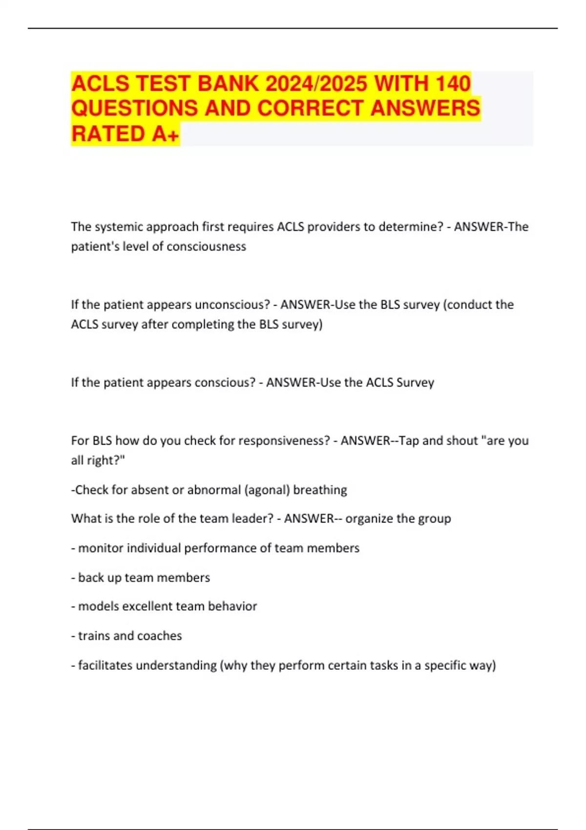 ACLS TEST BANK 2024/2025 WITH 140 QUESTIONS AND CORRECT ANSWERS RATED A+ The systemic approach first requires ACLS providers to determine? - ANSWER -The patient's level of consciousness If the patient appears unconscious? - ANSWER -Use the BLS survey (conduct the ACLS survey after completing the BLS survey) If the patient appea rs conscious? - ANSWER -Use the ACLS Survey For BLS how do you check for responsiveness? - ANSWER --Tap and shout "are you all right?" -Check for absent or abnormal (agonal) breathing What is the role of the team leader? - ANSWER -- organize the group - monitor individual performance of team members - back up team members - models excellent team behavior - trains and coaches - facilitates understanding (why they perform certain tasks in a specific way) ___ consist of concise communication spoken with distinctive speech in a controlled tone of voice - ANSWER -Clear message Messages and orders should be delivered in a ___ and ___ manner without yelling or shouting? - ANSWER -calm and direct What do you do after checking responsiveness in BLS? - ANSWER -Activate t he emergency response system/ get AED How do you check for circulation in BLS? - ANSWER --Check carotid pulse for 5 -10 seconds -no pulse, start CPR (30:2) (depth at least 2 inches) (rate at least 100/min) -minimize interruptions for compressions less than 10 seconds - switch providers every 2 min. Defibrillation in BLS? - ANSWER --check for shockable rhythm with AED -provide shock if indicated - follow each shock immediately with CPR What O2 saturation is indicated for cardiac arrest? - ANSWER -100% Titrat e O2 administration to acheive a saturation of? - ANSWER -> or = 94% If PetCO2 is <_____ attempt to improve CPR - ANSWER -10 mm Hg If diastolic pressure is <_____ attempt to improve CPR - ANSWER -20 mm Hg Suggested locat ions of team leader and members during case stimulations? - ANSWER -- airway - IV/IO meds - monitor/defibrillator - team leader - observer/ recorder - compressor If you need help? - ANSWER -ASK FOR IT EARLY Everyone on the team should know his or her ___? - ANSWER -Own limitations and capabilities Five links of the adult chain of survival? - ANSWER -- immediate recognition of cardiac arrest and activation of the emergency response system - early CPR with emphasis on chest compressions - rapid defibrillation - effective advanced life support