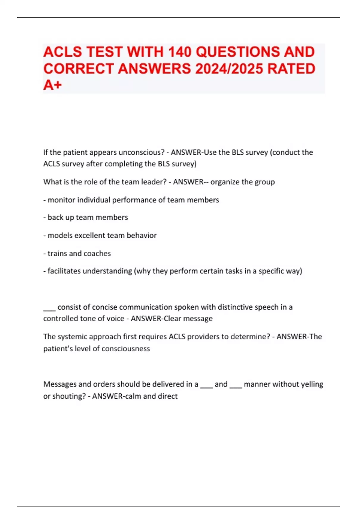 ACLS TEST WITH 140 QUESTIONS AND CORRECT ANSWERS 2024/2025 RATED A+ If the patient appears unconscious? - ANSWER -Use the BLS survey (conduct the ACLS survey after completing the BLS survey) What is the role of the team leader? - ANSWER -- organize the group - monitor individual performance of team members - back up team members - models excellent team behavior - trains and coaches - facilitates understanding (why they perform certain tasks in a specific way) ___ consist of concise communication spoken with distinctive speech in a controlled tone of voice - ANSWER -Clear message The systemic approach first requires ACLS providers to determine? - ANSWER -The patient's level of consciousness Messages and orders should be delivered in a ___ and ___ manner without yelling or shouting? - ANSWER -calm and direct If the patient appea rs conscious? - ANSWER -Use the ACLS Survey For BLS how do you check for responsiveness? - ANSWER --Tap and shout "are you all right?" -Check for absent or abnormal (agonal) breathing What do you do after checking responsiveness in BLS? - ANSWER -Activate t he emergency response system/ get AED How do you check for circulation in BLS? - ANSWER --Check carotid pulse for 5 -10 seconds -no pulse, start CPR (30:2) (depth at least 2 inches) (rate at least 100/min) -minimize interruptions for compressions less than 10 seconds - switch providers every 2 min. Defibrillation in BLS? - ANSWER --check for shockable rhythm with AED -provide shock if indicated - follow each shock immediately with CPR What O2 saturation is indicated for cardiac arrest? - ANSWER -100% Titrat e O2 administration to acheive a saturation of? - ANSWER -> or = 94% If PetCO2 is <_____ attempt to improve CPR - ANSWER -10 mm Hg If diastolic pressure is <_____ attempt to improve CPR - ANSWER -20 mm Hg Suggested locat ions of team leader and members during case stimulations? - ANSWER -- airway - IV/IO meds - monitor/defibrillator - team leader - observer/ recorder - compressor If you need help? - ANSWER -ASK FOR IT EARLY Everyone on the team should know his or her ___? - ANSWER -Own limitations and capabilities Five links of the adult chain of survival? - ANSWER -- immediate recognition of cardiac arrest and activation of the emergency response system - early CPR with emphasis on chest compressions - rapid defibrillation - effective advanced life support