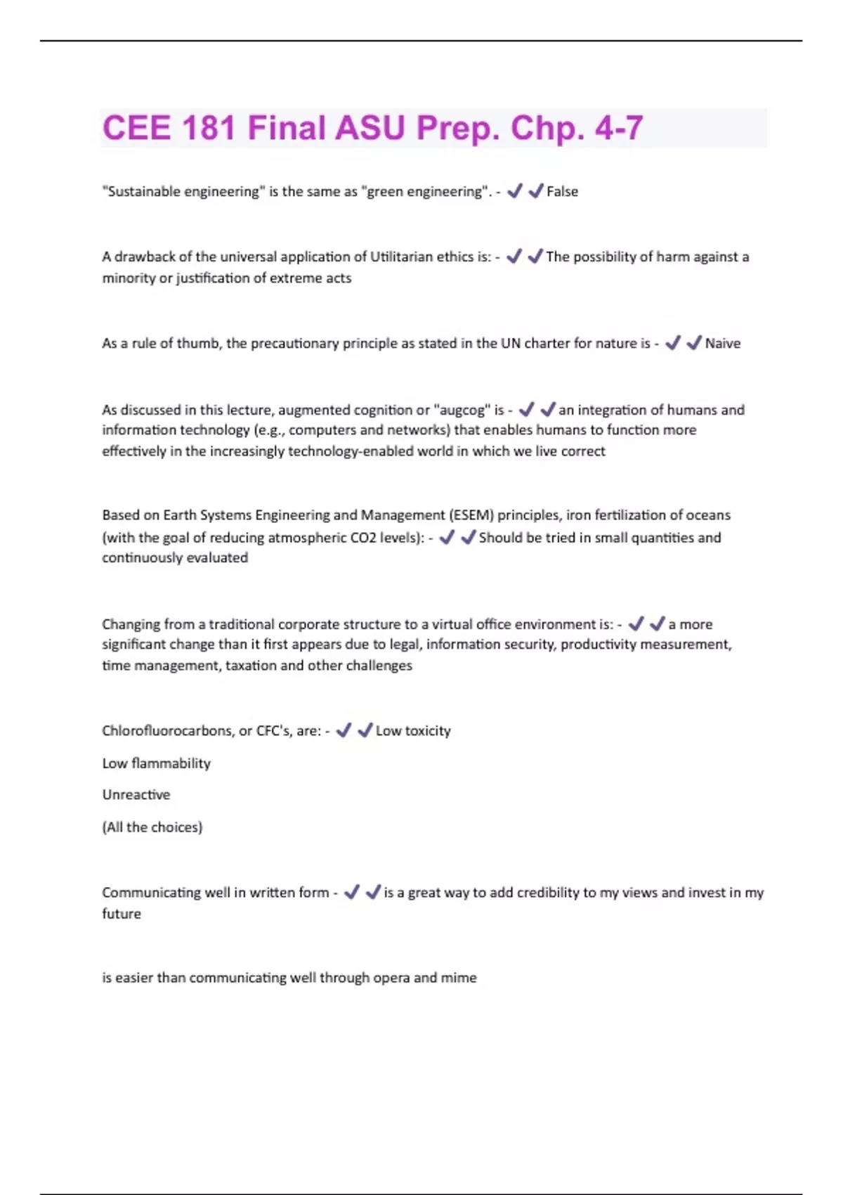 "Sustainable engineering" is the same as "green engineering". - False A drawback of the universal application of Utilitarian ethics is: - The possibility of harm against a minority or justification of extreme acts As a rule of thumb, the precautionary principle as stated in the UN charter for nature is - Naive As discussed in this lecture, augmented cognition or "augcog" is - an integration of humans and information technology (e.g., computers and networks) that enables humans to function more effectively in the increasingly technology-enabled world in which we live correct Based on Earth Systems Engineering and Management (ESEM) principles, iron fertilization of oceans (with the goal of reducing atmospheric CO2 levels): - Should be tried in small quantities and continuously evaluated Changing from a traditional corporate structure to a virtual office environment is: - a more significant change than it first appears due to legal, information security, productivity measurement, time management, taxation and other challenges Chlorofluorocarbons, or CFC's, are: - Low toxicity Low flammability Unreactive (All the choices) Communicating well in written form - is a great way to add credibility to my views and invest in my future is easier than communicating well through opera and mimeis a skill that is frequently requested and highly regarded by future employers is hard but is still among the easiest ways to progress in my career (All of these choices) correct Cyborg insects, consisting of electronic elements integrated into a live insect, are: - In the early experimental stages of development ESEM stands for what? - Earth Systems Engineering and Management Ethical questions have no "right" answer when they involve trade-off between two (or more) transcendent values - True Ethical theories like Utilitarianism and Virtue ethics make it very clear that capitalism is the right economic approach for the world. - False Ethics can be considered in many different contexts. A basic framework for sustainable ethics might consider the following: - Macroethical, Institutional, Professional, and Personal ethics correct Ethics is sometimes known as: - Moral Philosophy