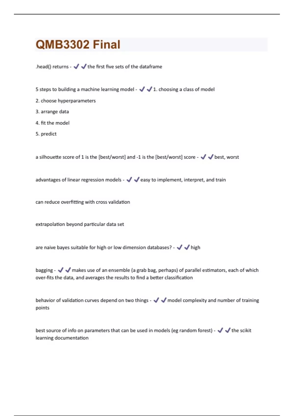 head() returns - the first five sets of the dataframe 5 steps to building a machine learning model - 1. choosing a class of model 2. choose hyperparameters 3. arrange data 4. fit the model 5. predict a silhouette score of 1 is the [best/worst] and -1 is the [best/worst] score - best, worst advantages of linear regression models - easy to implement, interpret, and train can reduce overfitting with cross validation extrapolation beyond particular data set are naive bayes suitable for high or low dimension databases? - high bagging - makes use of an ensemble (a grab bag, perhaps) of parallel estimators, each of which over-fits the data, and averages the results to find a better classification behavior of validation curves depend on two things - model complexity and number of training points best source of info on parameters that can be used in models (eg random forest) - the scikit learning documentationcentroids - points dropped around the numbers in order to measure a distance. points are assigned to the cluster, and the mean of those points create a new centroid classification in machine learning - a type of supervised learning where the goal is to assign input data points to predefined categories or classes classification problems - approximates a mapping function from input variables to identify discrete output variables, which can be labels or categories decision tree random forest K means neural networks cluster centers are - number of clusters chosen randomly to begin clustering cluster centers are updated - iteratively to minimize the within cluster sum of squares cluster regression - improves accuracy of linear regression by splitting training space into subspaces (K) Clustering Algorithms - to segment customers into different clusters to be able to target specific promotions to them clustering algos do what - measure distance bw observations does not necessarily mean two values or dimensions coefficient of determination - r^2 common uses for random forest algorithms - classification and regressi