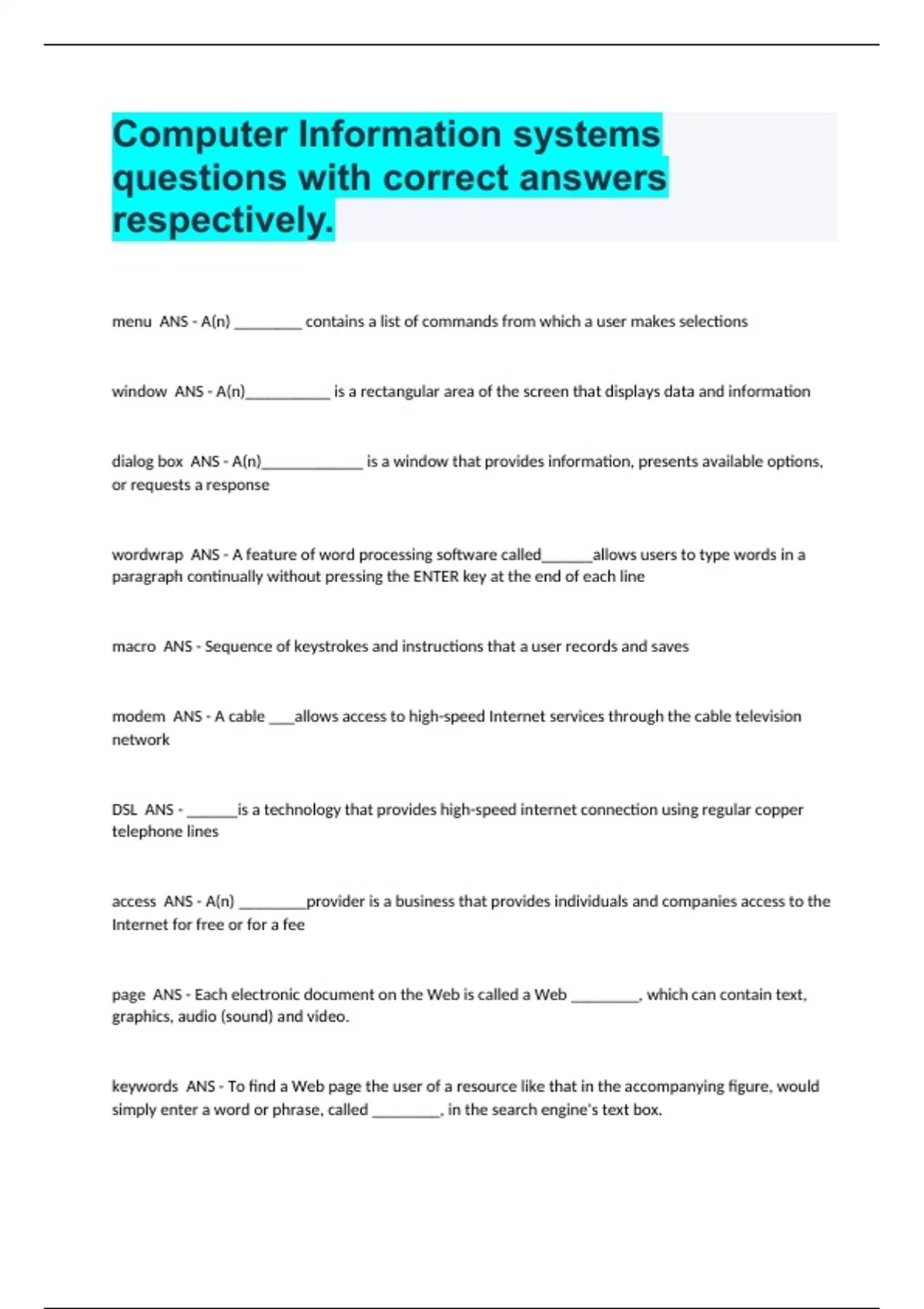 Computer Information systems questions with correct answers respectively.