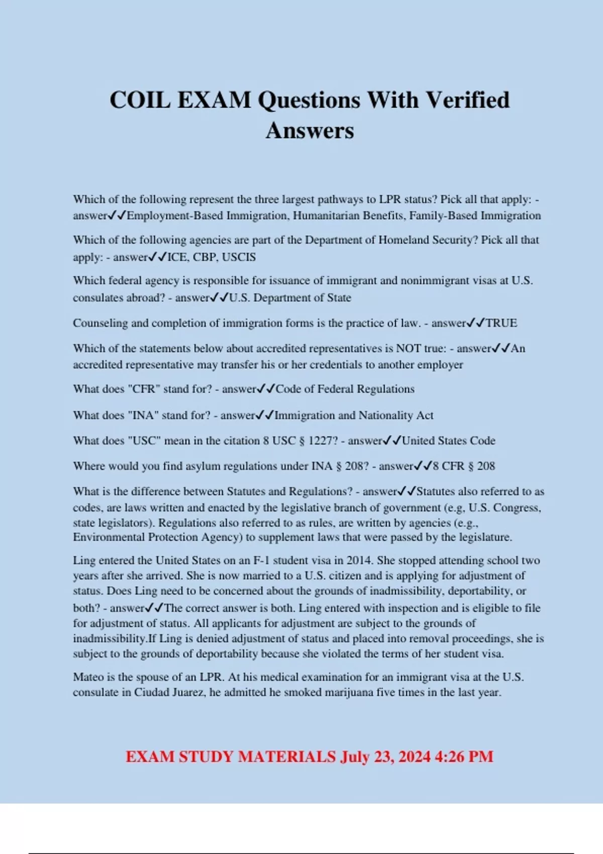 EXAM STUDY MATERIALS July 23, 2024 4:26 PM COIL EXAM Questions With Verified Answers Which of the following represent the three largest pathways to LPR status? Pick all that apply: - answerEmployment-Based Immigration, Humanitarian Benefits, Family-Based Immigration Which of the following agencies are part of the Department of Homeland Security? Pick all that apply: - answerICE, CBP, USCIS Which federal agency is responsible for issuance of immigrant and nonimmigrant visas at U.S. consulates abroad? - answerU.S. Department of State Counseling and completion of immigration forms is the practice of law. - answerTRUE Which of the statements below about accredited representatives is NOT true: - answerAn accredited representative may transfer his or her credentials to another employer What does "CFR" stand for? - answerCode of Federal Regulations What does "INA" stand for? - answerImmigration and Nationality Act What does "USC" mean in the citation 8 USC § 1227? - answerUnited States Code Where would you find asylum regulations under INA § 208? - answer8 CFR § 208 What is the difference between Statutes and Regulations? - answerStatutes also referred to as codes, are laws written and enacted by the legislative branch of government (e.g, U.S. Congress, state legislators). Regulations also referred to as rules, are written by agencies (e.g., Environmental Protection Agency) to supplement laws that were passed by the legislature. Ling entered the United States on an F-1 student visa in 2014. She stopped attending school two years after she arrived. She is now married to a U.S. citizen and is applying for adjustment of status. Does Ling need to be concerned about the grounds of inadmissibility, deportability, or both? - answerThe correct answer is both. Ling entered with inspection and is eligible to file for adjustment of status. All applicants for adjustment are subject to the grounds of inadmissibility.If Ling is denied adjustment of status and placed into removal proceedings, she is subject to the grounds of deportability because she violated the terms of her student visa. Mateo is the spouse of an LPR. At his medical examination for an immigrant visa at the U.S. consulate in Ciudad Juarez, he admitted he smoked marijuana five times in the last year. EXAM STUDY MATERIALS July 23, 2024 4:26 PM Assuming he is found inadmissible as a drug abuser, which of the following are his options: - answerHe may wait 12 months from the date of his last use of marijuana and apply again. Wu, from China, has been an LPR since 2005. Ten years ago, Wu was convicted of larceny and sentenced to two years of probation. Which of the statements below best describes Wu's circumstances: - answerIf Wu is placed in removal proceedings, he will be charged with a ground of deportability because he was inspected and admitted as a lawful permanent resident. The fact that Wu was only sentenced to probation does not mean that his conviction can't make him deportable. Similarly, Wu is not protected from being placed in removal proceedings simply because many years have gone by since he was convicted. There is a specific ground of deportability for certain firearm offenses but no parallel ground of inadmissibility for a conviction for certain firearm offenses. - answerUnder INA § 237(a)(2)(C), a noncitizen is deportable if at any time after admission, he or she is convicted of any law of purchasing, selling, exchanging, using, owning, possessing or carrying any weapon in violation of law or conspiring or attempting to do the same. There is no parallel ground of inadmissibility specifically for firearm offenses. If you encounter a client with prior arrests or convictions, which of the following should you do to better understand the consequences of your client's conduct: - answerCounsel your client about the importance of providing information to you about all prior contacts with law enforcement; DHS will have this information and you need it too in order to counsel the client. Do a law enforcement data base check (FBI records check and/or state records check) to find out your client's arrest history. Do a FOIA for your client's immigration records if s/he has ever been detained or in immigration court. Obtain copies of all court records related to charges brought against your client. In 2014 Enrique sent money to his brother Manuel to buy a fake visa to travel to the United States. Enrique and Manuel now reside together in Chicago and both are planning to immigrate soon through petitions filed by their LPR father. Which of the following statements is most accurate about Enrique: - answerEnrique is not eligible to immigrate because he is inadmissible for smuggling and does not qualify for a waiver. Financial support for the brother to buy the fake visa is aiding and abetting smuggling. Enrique is not eligible to apply for a waiver of the inadmissibility because he smuggled someone other than his parent, spouse, son, or daughter. Which of the following stops the running of unlawful presence? - answerFiling an application for adjustment of status, Filing a timely and good faith application to extend one's nonimmigrant stay, Filing a bona fide application for asylum, as long as the applicant does not work without authorization, Filing a successful ap