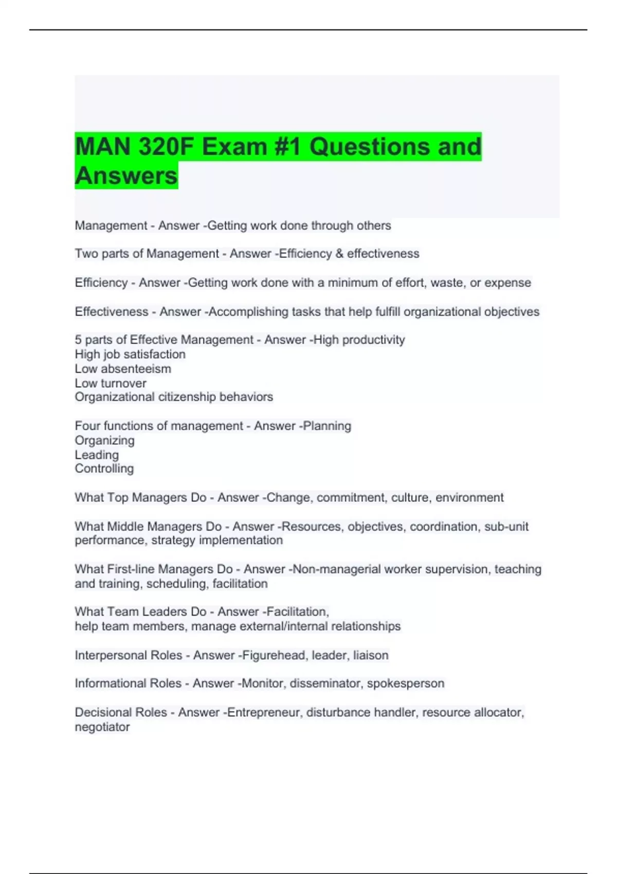 MAN 320F Exam #1 Questions and Answers