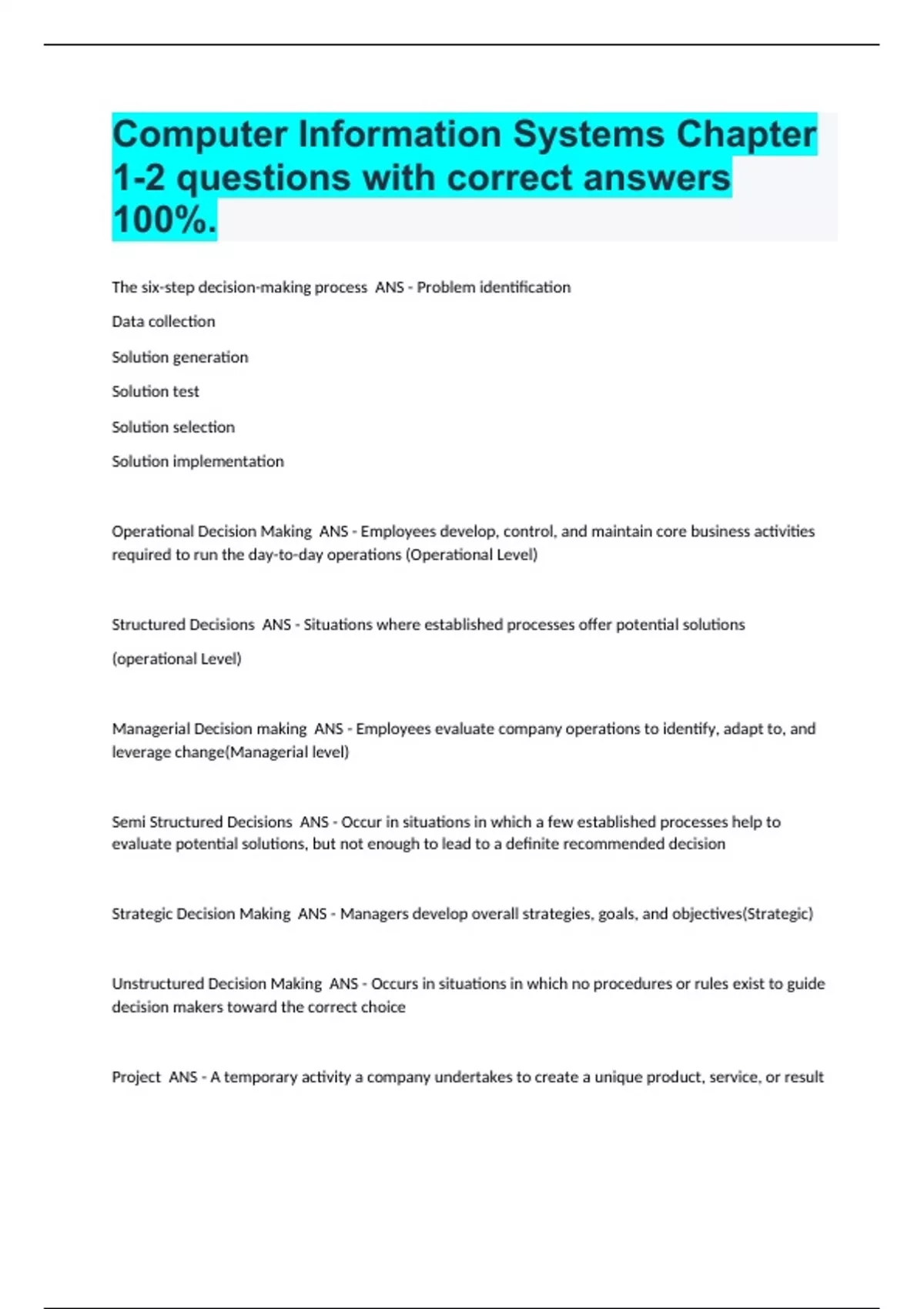 Computer Information Systems Chapter 1-2 questions with correct answers 100%.