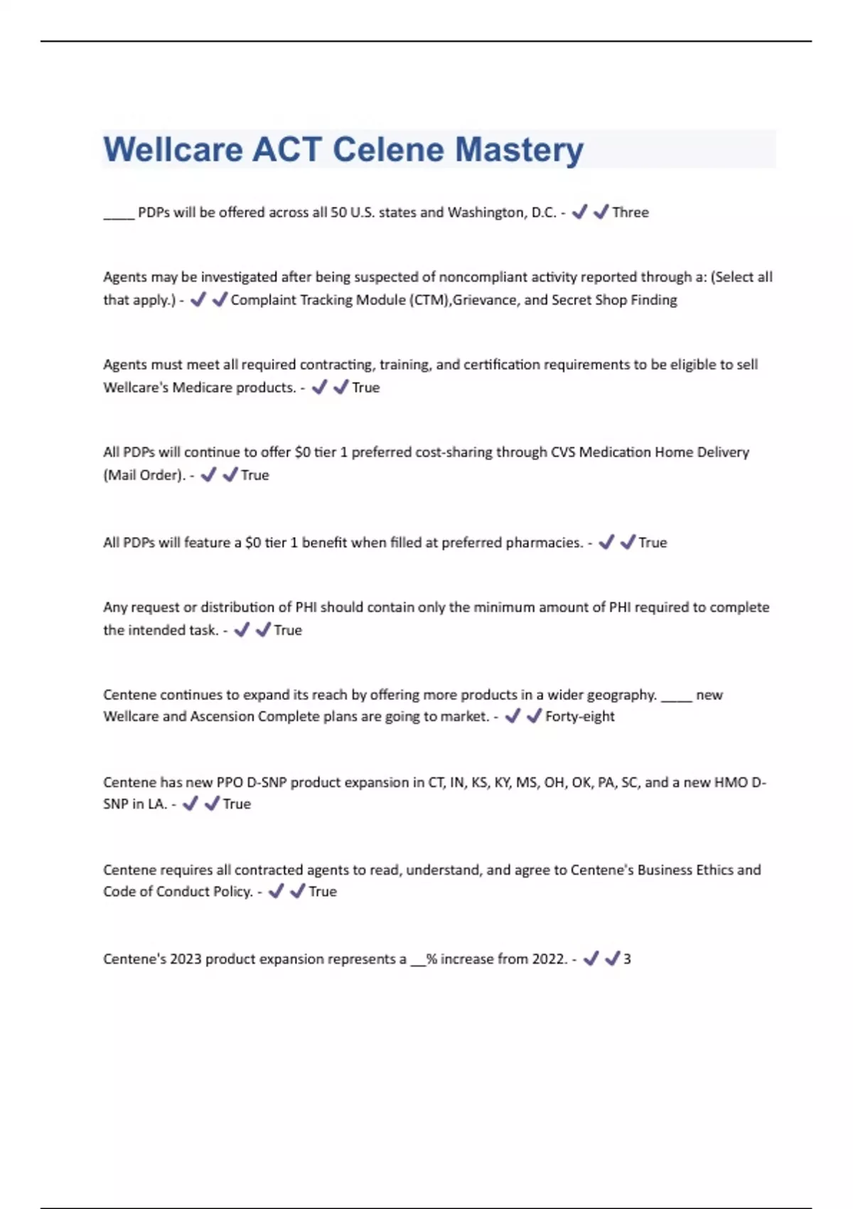 ____ PDPs will be offered across all 50 U.S. states and Washington, D.C. - Three Agents may be investigated after being suspected of noncompliant activity reported through a: (Select all that apply.) - Complaint Tracking Module (CTM),Grievance, and Secret Shop Finding Agents must meet all required contracting, training, and certification requirements to be eligible to sell Wellcare's Medicare products. - True All PDPs will continue to offer $0 tier 1 preferred cost-sharing through CVS Medication Home Delivery (Mail Order). - True All PDPs will feature a $0 tier 1 benefit when filled at preferred pharmacies. - True Any request or distribution of PHI should contain only the minimum amount of PHI required to complete the intended task. - True Centene continues to expand its reach by offering more products in a wider geography. ____ new Wellcare and Ascension Complete plans are going to market. - Forty-eight Centene has new PPO D-SNP product expansion in CT, IN, KS, KY, MS, OH, OK, PA, SC, and a new HMO DSNP in LA. - True Centene requires all contracted agents to read, understand, and agree to Centene's Business Ethics and Code of Conduct Policy. - True Centene's 2023 product expansion represents a __% increase from 2022. - 3Failure to inform a beneficiary that a trusted provider is out-of-network or is not available in the newly selected plan can cause a sales allegation. - True For 2023, Ascension Complete added 27 new counties to their footprint. - True For PDP Medication Home Delivery, the ____ plan will continue to offer a discount for 90-day tier 2, tier 3 and tier 6 prescriptions. - Value Plus Medicare Star Ratings and performance are at the forefront of Wellcare's quality strategy. Wellcare's quality focus consists of six drivers. Which of the following is not a Wellcare quality driver? - Member Payments - (The Six Drivers are Member Service, Serving Government Customers, Selection and Enrollment, Reputation, Requirement of Participation, Bonus Payment.) Member PHI can be stored on an external hard drive or a cloud storage service like Google Drive or Apple Cloud. - False Noting the correct enrollment period on enrollment applications helps in preventing delayed enrollment processing. - True Once the enrollment is completed, you can save a copy of the application for your reference. - False The _________ plan is expected to have one of the lowest premiums in the country! - Value Script The information contained within ACT will equip agents to certify, market, and sell which health plans? - All of the above (Ascension Complete and Wellcare) There are ___ LIS copay categories that could be assigned to a member, depending on the level of need. - FourTo ensure accurate data entry, you should repeat the Medicare ID back to the beneficiary. Select One - True Upon completion of the application, you must provide the beneficiary with the enrollment application confirmation ID. - True