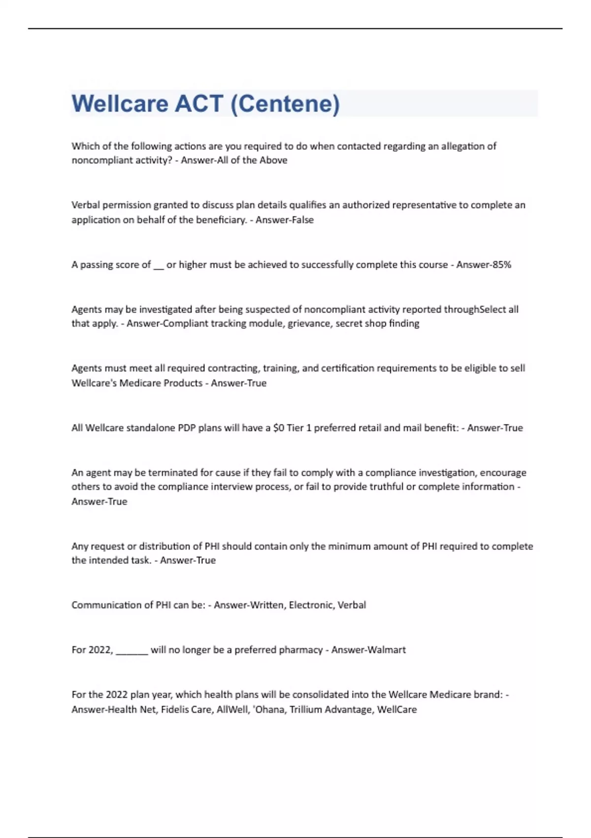 Which of the following actions are you required to do when contacted regarding an allegation of noncompliant activity? - Answer-All of the Above Verbal permission granted to discuss plan details qualifies an authorized representative to complete an application on behalf of the beneficiary. - Answer-False A passing score of __ or higher must be achieved to successfully complete this course - Answer-85% Agents may be investigated after being suspected of noncompliant activity reported throughSelect all that apply. - Answer-Compliant tracking module, grievance, secret shop finding Agents must meet all required contracting, training, and certification requirements to be eligible to sell Wellcare's Medicare Products - Answer-True All Wellcare standalone PDP plans will have a $0 Tier 1 preferred retail and mail benefit: - Answer-True An agent may be terminated for cause if they fail to comply with a compliance investigation, encourage others to avoid the compliance interview process, or fail to provide truthful or complete information - Answer-True Any request or distribution of PHI should contain only the minimum amount of PHI required to complete the intended task. - Answer-True Communication of PHI can be: - Answer-Written, Electronic, Verbal For 2022, ______ will no longer be a preferred pharmacy - Answer-Walmart For the 2022 plan year, which health plans will be consolidated into the Wellcare Medicare brand: - Answer-Health Net, Fidelis Care, AllWell, 'Ohana, Trillium Advantage, WellCareKey areas you as a Sales Agent / Broker have control over and impact upon regarding Star (Quality) Ratings are - Answer-All of the Above Medicare Star Ratings and performance are at the forefront of Wellcare's quality strategy. Wellcare's quality focus consists of six drivers. Which of the following is not a Wellcare quality driver? - AnswerMember Payments Noting the correct enrollment period on enrollment applications helps in preventing delayed enrollment processing: - Answer-True A grievance request, or any evidence concerning a grievance, must be filed orally or in writing no later than _____ calendar days from the date of the event or the date the member is made aware of the issue. - Answer-60 Steps to take when safeguarding and securing PHI and PII include - Answer-All of the Above The Part D Senior Savings Model (SSM), which reduces member spending on insulin, will be offered on the Value Script and Value Plus products - Answer-True