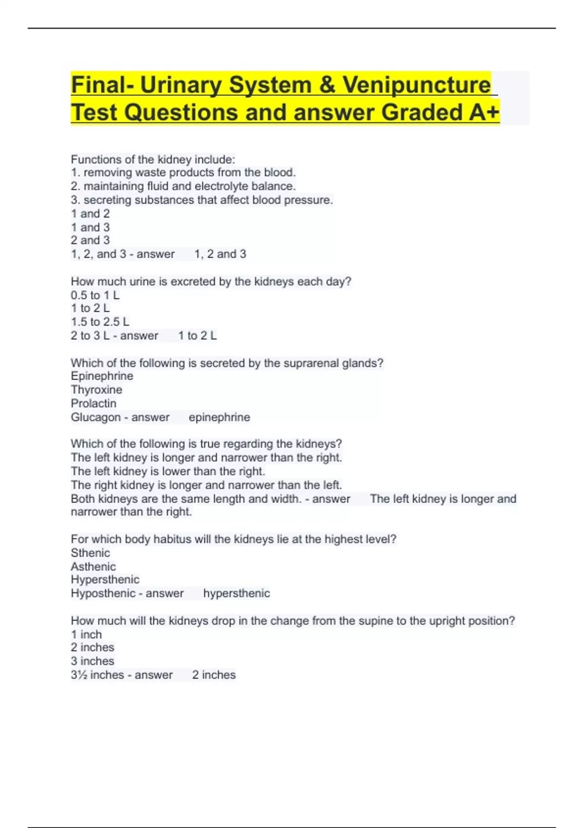 Final- Urinary System & Venipuncture Test Questions and answer Graded A+