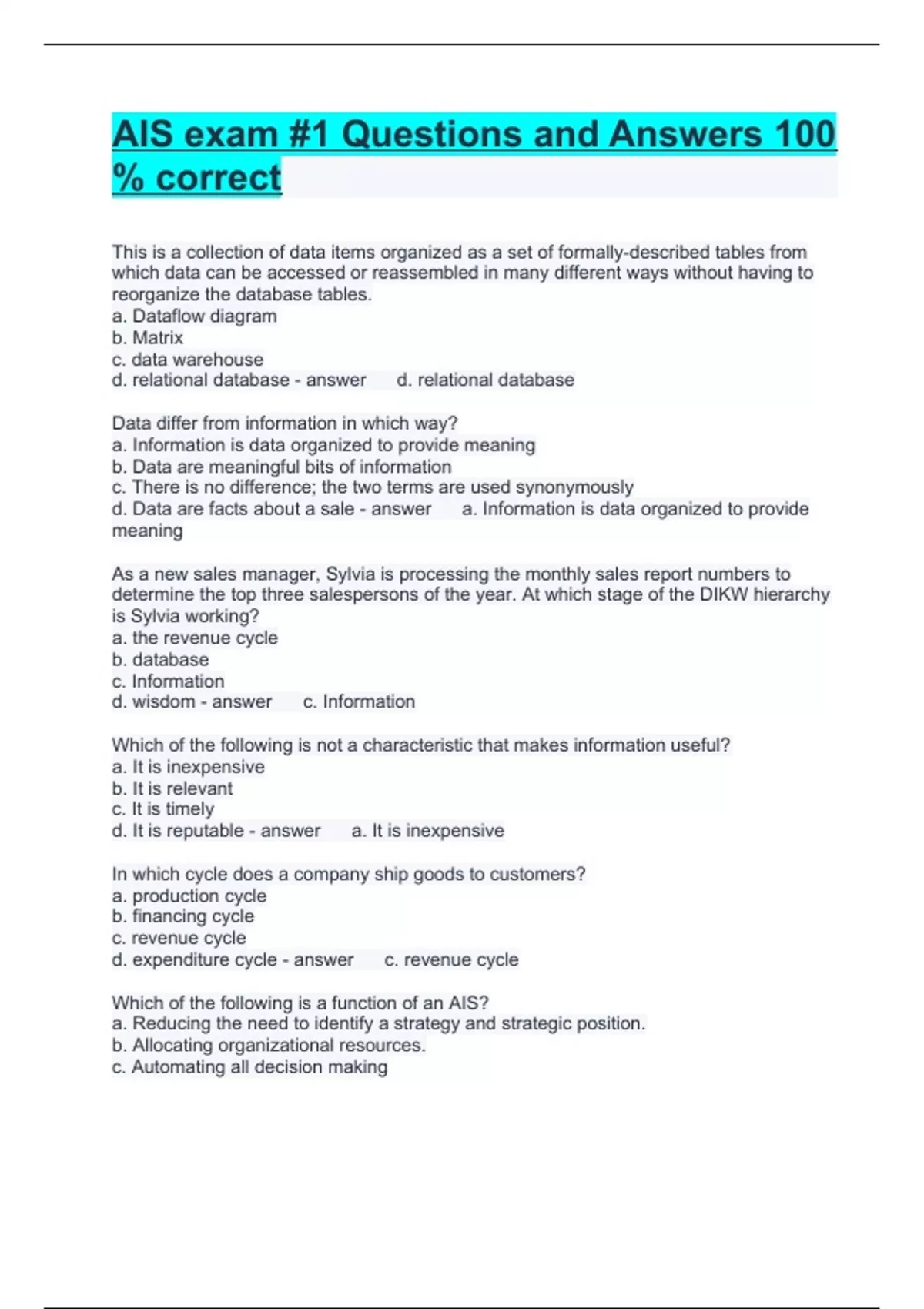 d. Data are facts about a sale - answer a. Information is data organized to provide