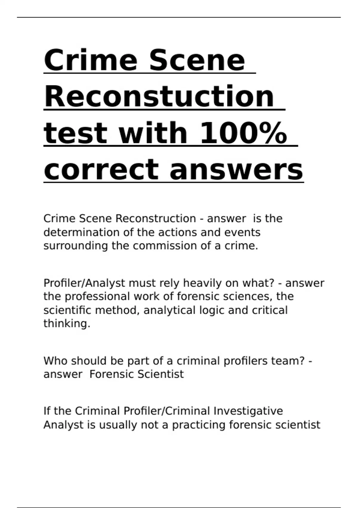Crime Scene Reconstruction is the determination of the actions and events surrounding the commission of a crime. Profiler/Analyst must rely heavily on what? the professional work of forensic sciences, the scientific method, analytical logic and critical thinking. Previous Play Next Rewind 10 seconds Move forward 10 seconds Unmute 0:01 / 0:15 Full screen Brainpower Read More Who should be part of a criminal profilers team? Forensic Scientist If the Criminal Profiler/Criminal Investigative Analyst is usually not a practicing forensic scientist additional training is needed (specially in the case of the BEA) A reconstruction may be accomplished by using the -Statements of witnesses - The confession of a suspect - The statement of a living victim - The examination and interpretation of physical evidence. Locard's exchange principle refers to an exchange of material that occurs when two objects come into contact. Contact between two items, there will be an exchange of microscopic material Crime scene reconstruction requires an understanding of Locard's exchange principle, the ability to recognize and mitigate bias, and the willingness to abandon theories once they have been disproved (metacognition). Performing crime reconstruction one must be capable of critical thinking -Must have the ability to discern fact from speculation -Theorize alternative solutions for events -Must be able to connect facts together -Make informed judgment about what questions are important to ask of the evidence in the case at hand The process of reconstruction: 1) Observe the evidence of events and related cues 2) Determine what might be learned of events from each observation 3) Hypothesize what the clue or observation means in light of the crime 4) Propose alternative explanations for events 5) Eliminate alternatives with analytical logic, critical thinking, and experimentation 6) Sequence events until the picture is complete Evidence Classification Types 11 types Sequential evidence Anything that establishes or helps to establish when an event occurred or the order in which two or more events occurred Directional evidence Anything that shows where something was going or where it came from Locational evidence Shows where something happened, or where something was, and its orientation with respect to other objects at the location Action evidence Defines anything that happened during the commission of the crime Contact evidence Something that demonstrates whether and how two persons, objects, or locations were at one point associated with each other Ownership evidence Something that helps answer the Who question with a high degree of certainty Associative evidence Usually a form of trace evidence that can be identiDication or ownership evidence Limiting evidence Defines the nature and boundaries of the crime scene Inferential evidence Anything that the reconstructionist thinks may have been at the scene when the crime occurred but was not actually found Temporal evidence Anything that specifically denotes or expresses the passage of time at the crime scene relative to the commission of the crime Psychological evidence Any act committed by the perpetrator to satisfy a personal need or motivation Evidence dynamics refers to any influence that adds, changes, relocates, contaminates, or obliterates physical evidence, regardless of intent. Assumption of Integrity that evidence left behind at a scene has been guarded and left undisturbed prior to the arrival of police investigators and other respon