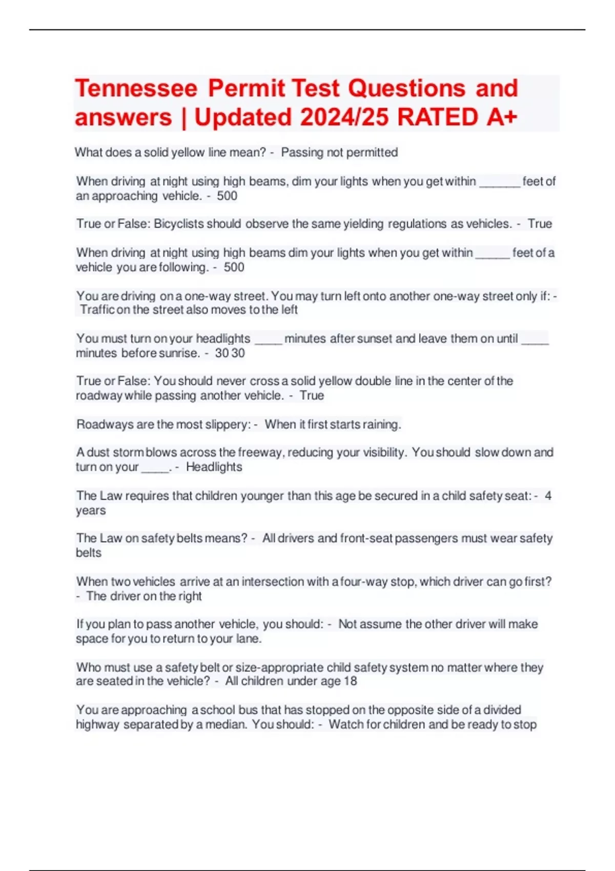 Tennessee Permit Test Questions and answers | Updated 2024/25 RATED A+