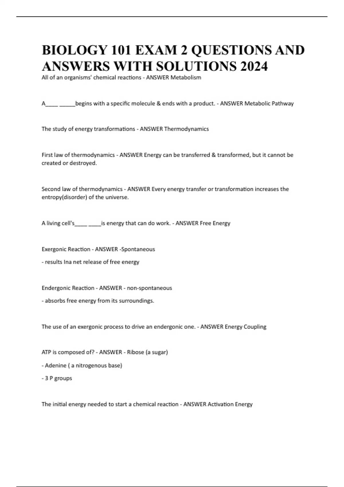 BIOLOGY 101 EXAM 2 QUESTIONS AND ANSWERS WITH SOLUTIONS 2024