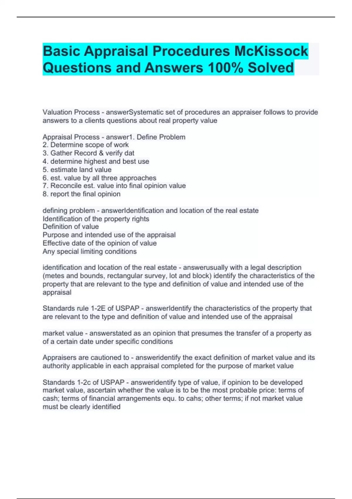 Basic Appraisal Procedures McKissock Questions and Answers 100% Solved Valuation Process Systematic set of procedures an appraiser follows to provide answers to a clients questions about real property value Appraisal Process 1. Define Problem 2. Determine scope of work 3. Gather Record & verify dat 4. determine highest and best use 5. estimate land value 6. est. value by all three approaches 7. Reconcile est. value into final opinion value 8. report the final opinion defining problem Identification and location of the real estate Identification of the property rights Definition of value Purpose and intended use of the appraisal Effective date of the opinion of value Any special limiting conditions identification and location of the real estate usually with a legal description (metes and bounds, rectangular survey, lot and block) identify the characteristics of the property that are relevant to the type and definition of value and intended use of the appraisal Standards rule 1-2E of USPAP Identify the characteristics of the property that are relevant to the type and definition of value and intended use of the appraisal market value stated as an opinion that presumes the transfer of a property as of a certain date under specific conditions Appraisers are cautioned to identify the exact definition of market value and its authority applicable in each appraisal completed for the purpose of market value Standards 1-2c of USPAP identify type of value, if opinion to be developed market value, ascertain whether the value is to be the most probable price: terms of cash; terms of financial arrangements equ. to cahs; other terms; if not market value must be clearly identified purpose of the assignment objective of assignment. ex: to develop an opinion of the defined value of a specified interest in real estate intended user client and any other party as identified by name or type as users of the appraisal review report by the appraiser retrospective and prospective value Two dates are essential to an appraisal report. Standards Rules 2-2(a)(vi) and 2-2(b)(vi) and 8-2(a)(vi) and 8-2(b)(vi) require that each appraisal report specify the effective date of the appraisal and the date of the report standards 1-2d of USPAP identify the effective date of the appraisers opinions and conclusions extraordinary assumption an assignment specific assumption as of the effective date if which found to be false could alter the appraisers opinions or conclusions hypothetical edition condition directly related to specific assignment which is contrary to what is known by the appraiser to exist on the effective date of assignment results but is used for the purpose of analysis Advisory opinions-22 os USPAP Accomplishing the first four action steps (SR 1-2(a) through (d))... ...provides the basis for deciding which of the property's characteristics are relevant in the assignment determine scope of work the type and extent of research and analysis or appraisal review assignment advisory opinion-22 understanding whihc analysis methods and techniques are necessary and what data are necessary to correctly complete the analysis is an integral part of the scope of work decision standards rule 1-2h of USPAP determine the scope of work necessary to produce credible results in accordance with the SCOPE OF WORK RULE scope of work rule identify problem; determine and perform the scope of work necessary to develop credible assignment results; disclose scope of work in the report scope of work includes but is not limited to: the extent to which the property is identified; the extent to which tangible property is inspected; the type and extent of data researched; and the type and extent of analyses applied to arrive at opinions or conclusions. standards rule 2-2a in USPAP summarize the scope of work used to develop the appraisal workfile documentation necessary to support an appraiser's analyses, opinions, and conclusions record keeping rule an appraiser must prepare a workfile for each appraisal or appraisal review assignment workfile must include name of client and identity by name or type of any other users; true copies of all written reports, documented on any type of media; summaries of any oral reports or testimony, or a transcript of testimony, including the appraiser's signed and dated certification; all other data, information, and documentation necessary to support the appraiser's opinions and conclusions and to show compliance with USPAP how long does an appraiser have to keep his workfile at least 5 hyears after peperation or at least two years after final disposition of any judicial proceeding in which had to testify workfile custody access and retrieval An appraiser must have custody of his or her workfile, or make appropriate workfile retention, access, and retrieval arrangements with the party having custody of the workfile verify to prove the truth of by the presentation of evidence or testimony verification process of validating or estab. the truth about info from another source which is critical to credibility the highest and best use of a property must be: legally permissible, physically, possible, financially feasible, and maximally productive applicable approaches to value cost, sales comp, income and capitalization appraoches reconciliation come to one reasoned opinion of value at the effective date general data data that relates to the four forces that affect real property values social economic governmental and environmental forces (macr0-level data) specific data details about property's being appraised national association of homebuilders does extensive research on current construction trends and figures