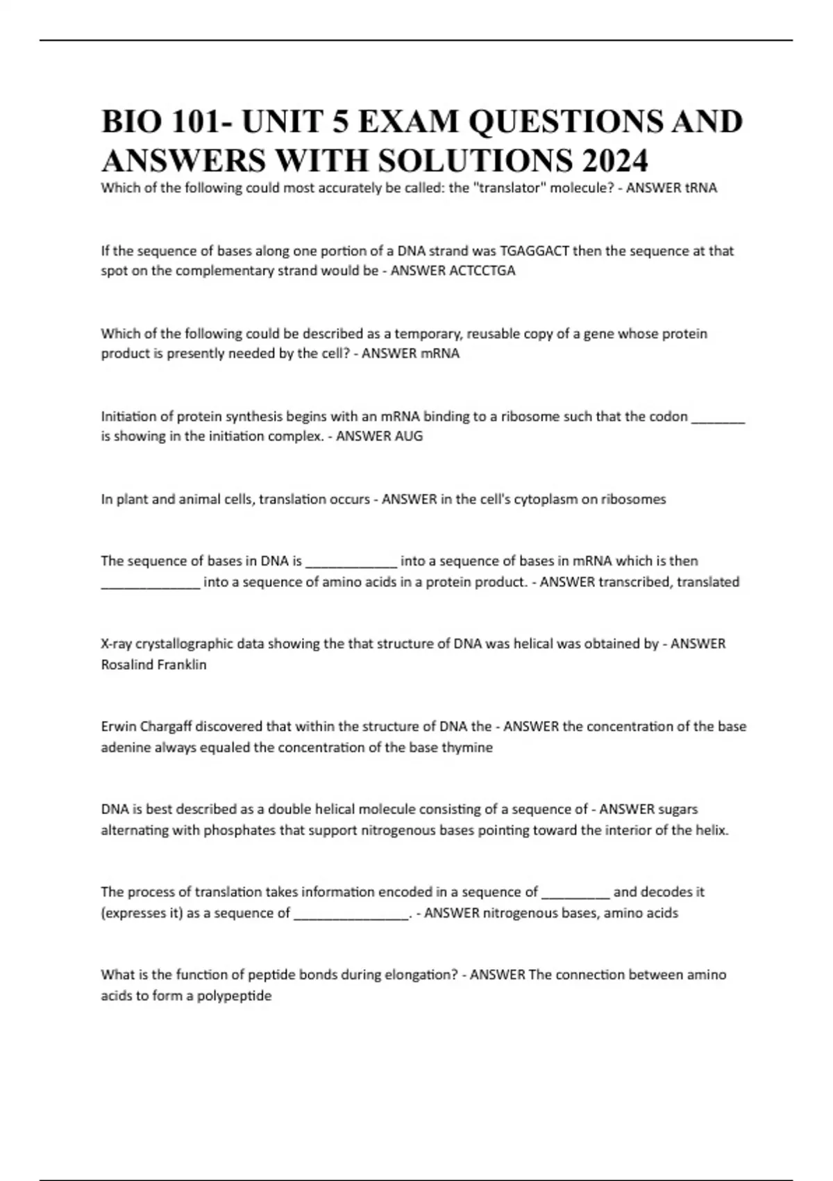BIO 101- UNIT 5 EXAM QUESTIONS AND ANSWERS WITH SOLUTIONS 2024