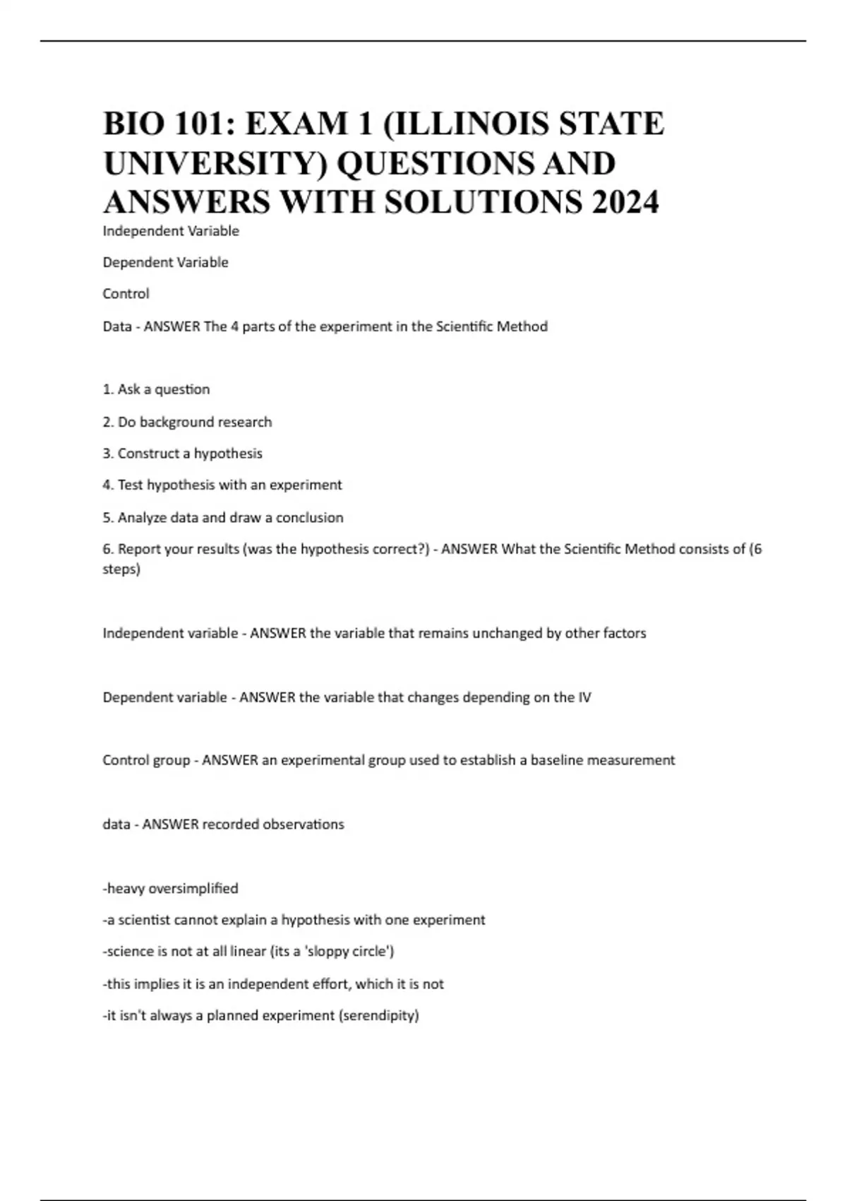 BIO 101: EXAM 1 (ILLINOIS STATE UNIVERSITY) QUESTIONS AND ANSWERS WITH SOLUTIONS 2024