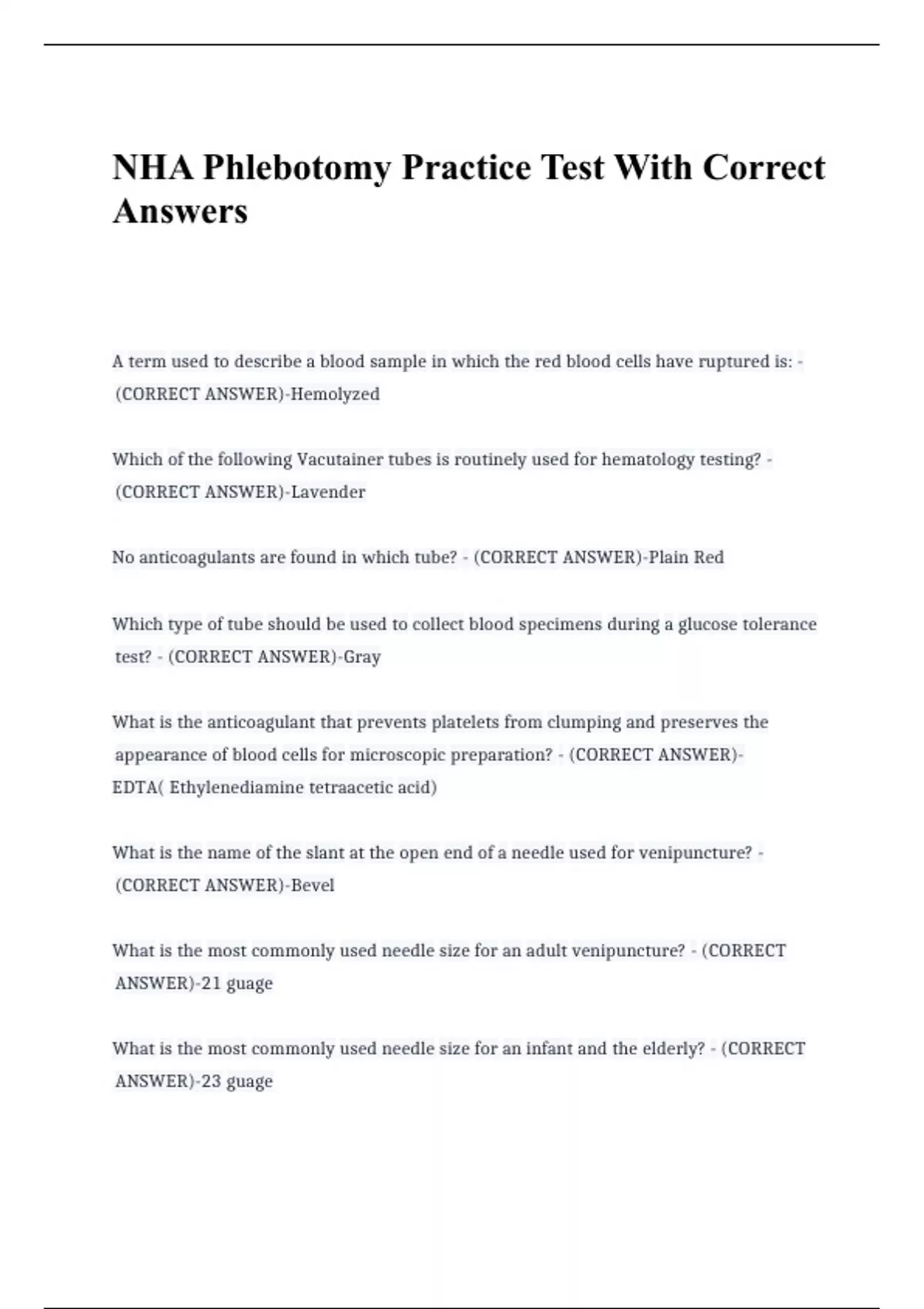 NHA Phlebotomy Practice Test With Correct Answers.