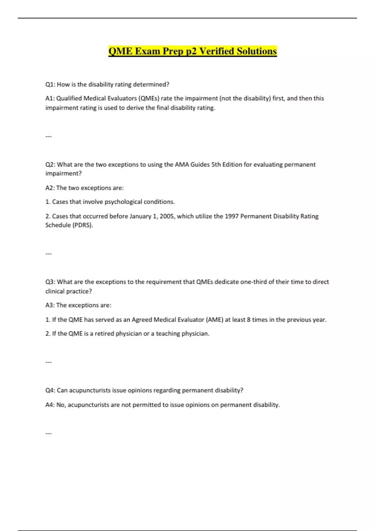 A1: Qualified Medical Evaluators (QMEs) rate the impairment (not the disability) first, and then this