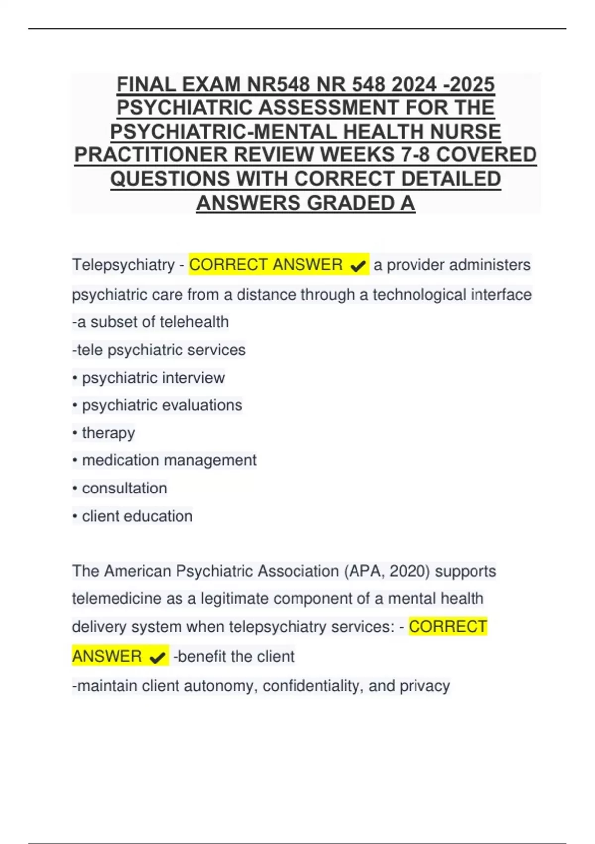 FINAL EXAM NR548 NR PSYCHIATRIC ASSESSMENT FOR THE PSYCHIATRIC-MENTAL HEALTH NURSE PRACTITIONER REVIEW WEEKS 7-8 COVERED QUESTIONS WITH CORRECT DETAILED ANSWERS GRADED A