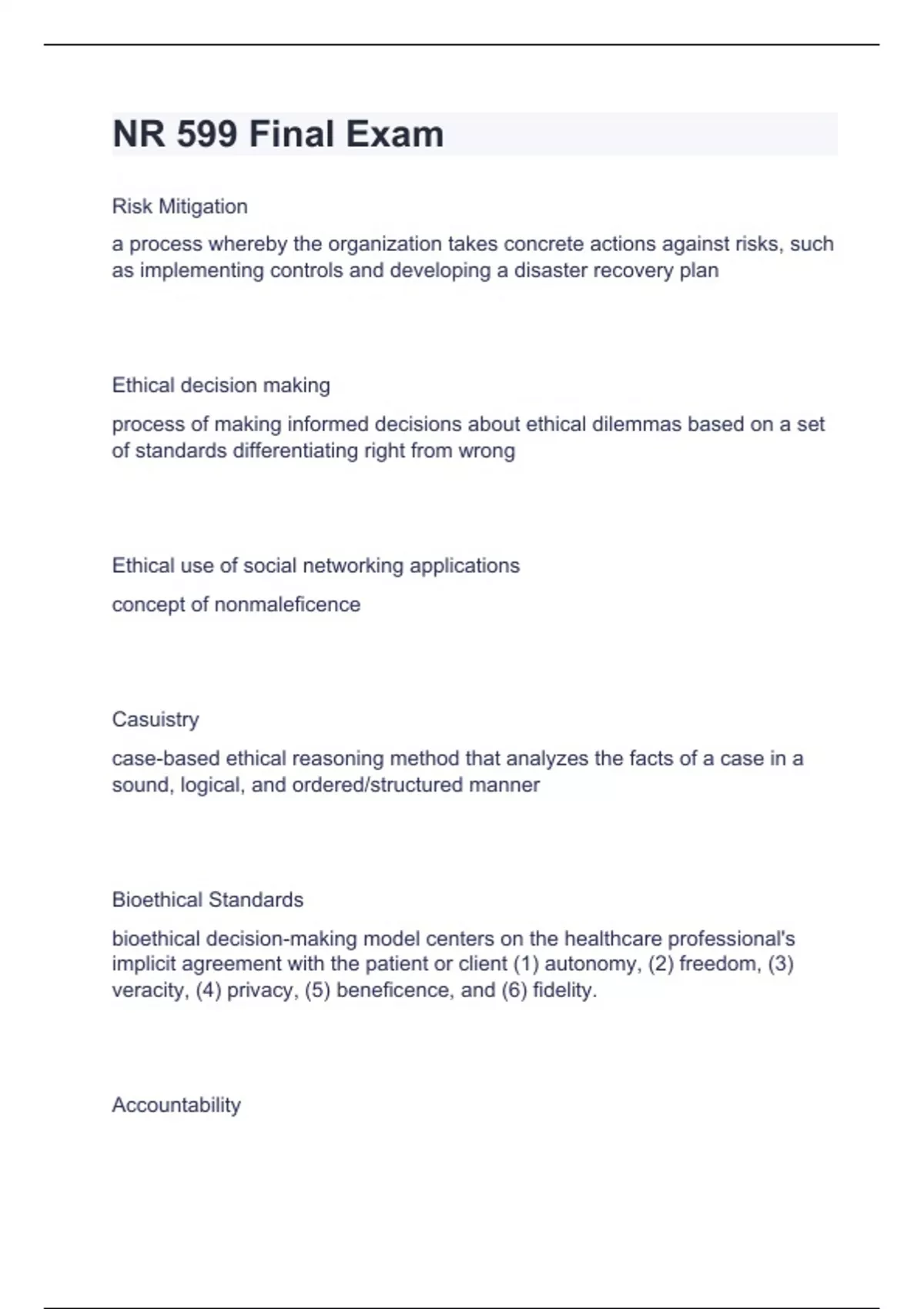 NR 599 Final Exam Chamberlain College Nursing Question and answers correctly solved NR 599 Final Exam Risk Mitigation a process whereby the organization takes concrete actions against risks, such as implementing controls and developing a disaster recovery plan Ethical decision making process of making informed decisions about ethical dilemmas based on a set of standards differentiating right from wrong Ethical use of social networking applications concept of nonmaleficence Casuistry case-based ethical reasoning method that analyzes the facts of a case in a sound, logical, and ordered/structured manner Bioethical Standards bioethical decision-making model centers on the healthcare professional's implicit agreement with the patient or client (1) autonomy, (2) freedom, (3) veracity, (4) pr