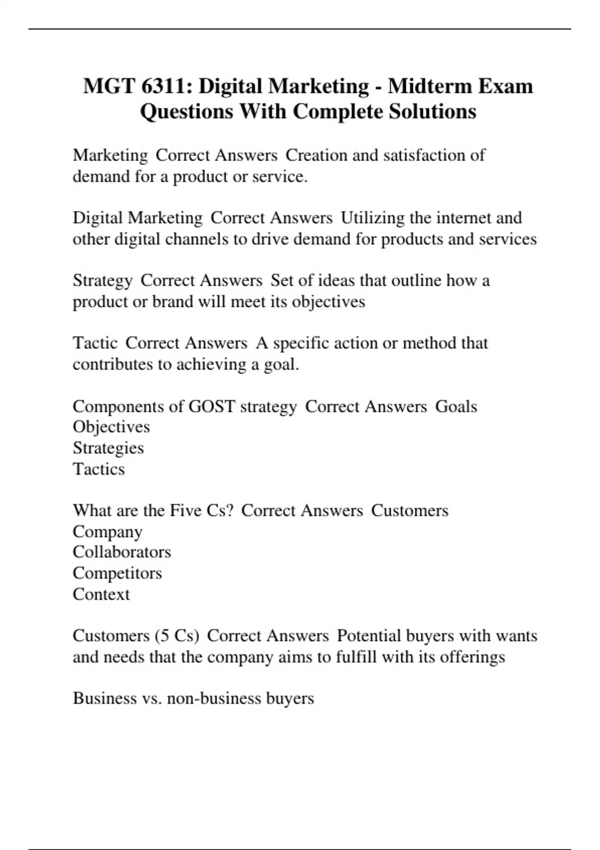 Customers (5 Cs) Correct Answers Potential buyers with wants