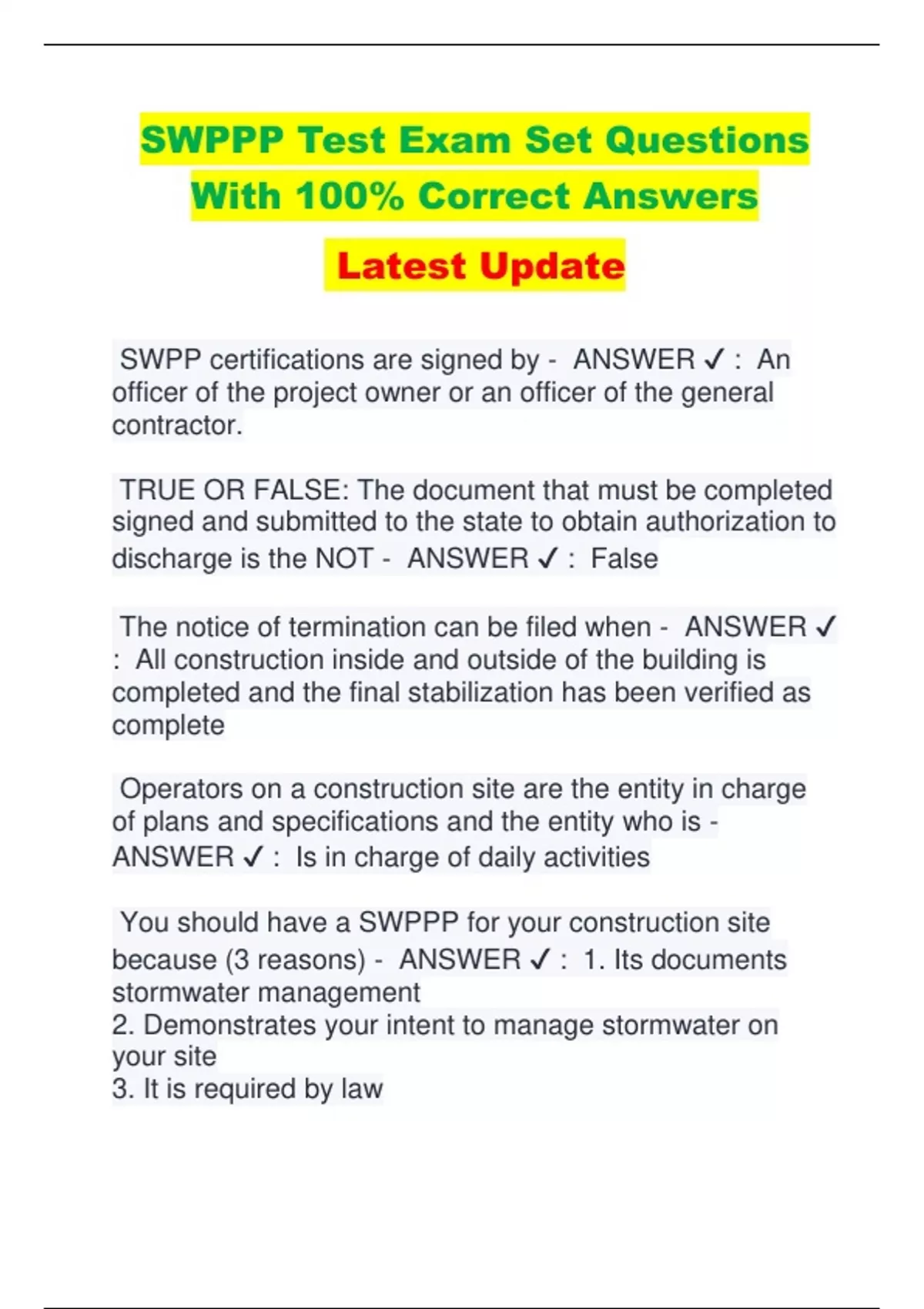 SWPPP Test Exam Set Questions With 100% Correct Answers Latest Update SWPP certifications are signed by - ANSWER : An officer of the project owner or an officer of the general contractor. TRUE OR FALSE: The document that must be completed signed and submitted to the state to obtain authorization to discharge is the NOT - ANSWER : False The notice of termination can be filed when - ANSWER : All construction inside and outside of the building is completed and the final stabilization has been verified as complete Operators on a construction site are the entity in charge of plans and specifications and the entity who is - ANSWER : Is in charge of daily activities You should have a SWPPP for your construction site because (3 reasons) - ANSWER : 1. Its documents stormwater management 2. Demonstrates your intent to manage stormwater on your site 3. It is required by law A well constructed SWPPP for your site should be - ANSWER : Site specific