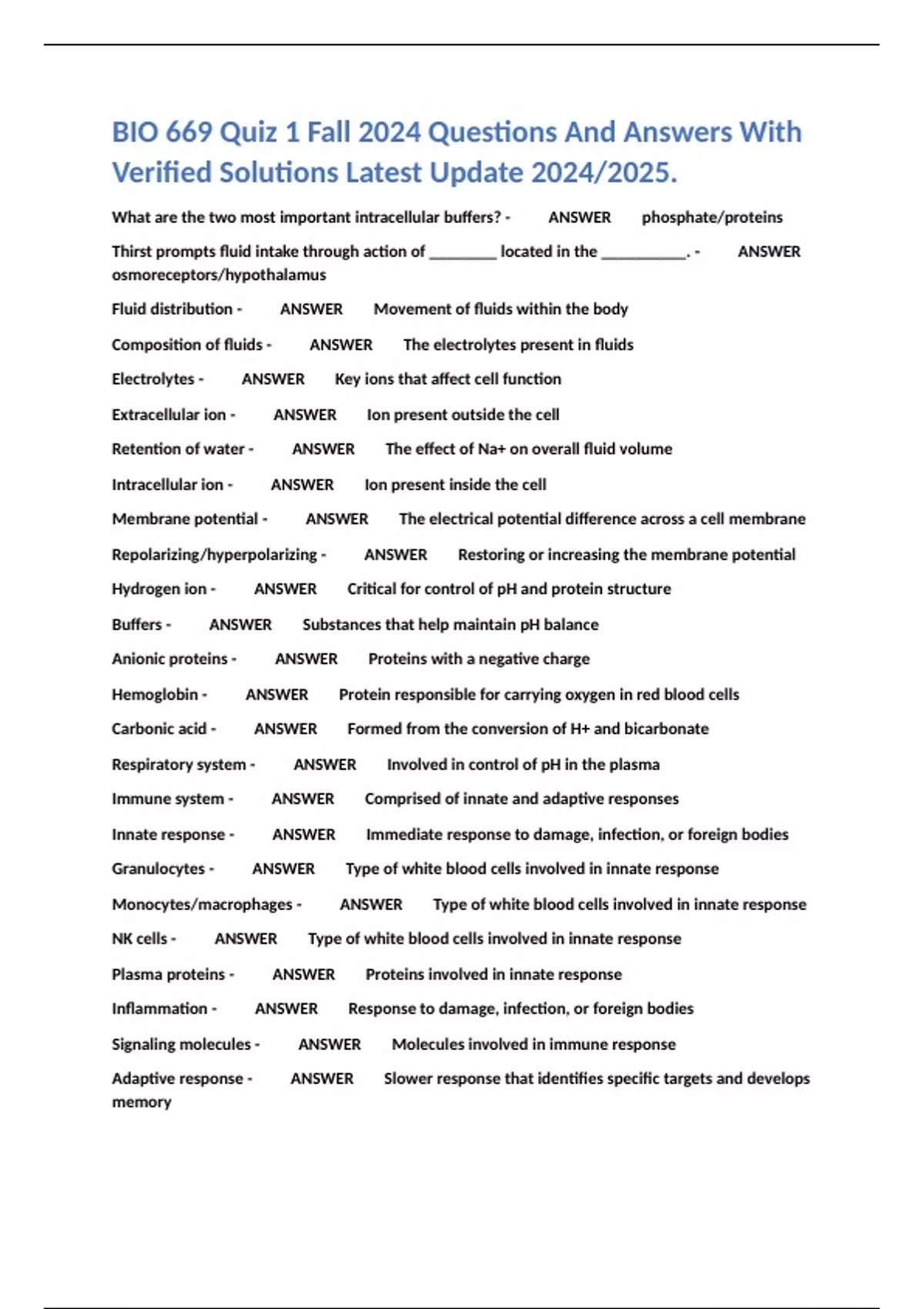 BIO 669 Quiz 1 Fall 2024 Questions And Answers With Verified Solutions Latest Update 2024/2025.