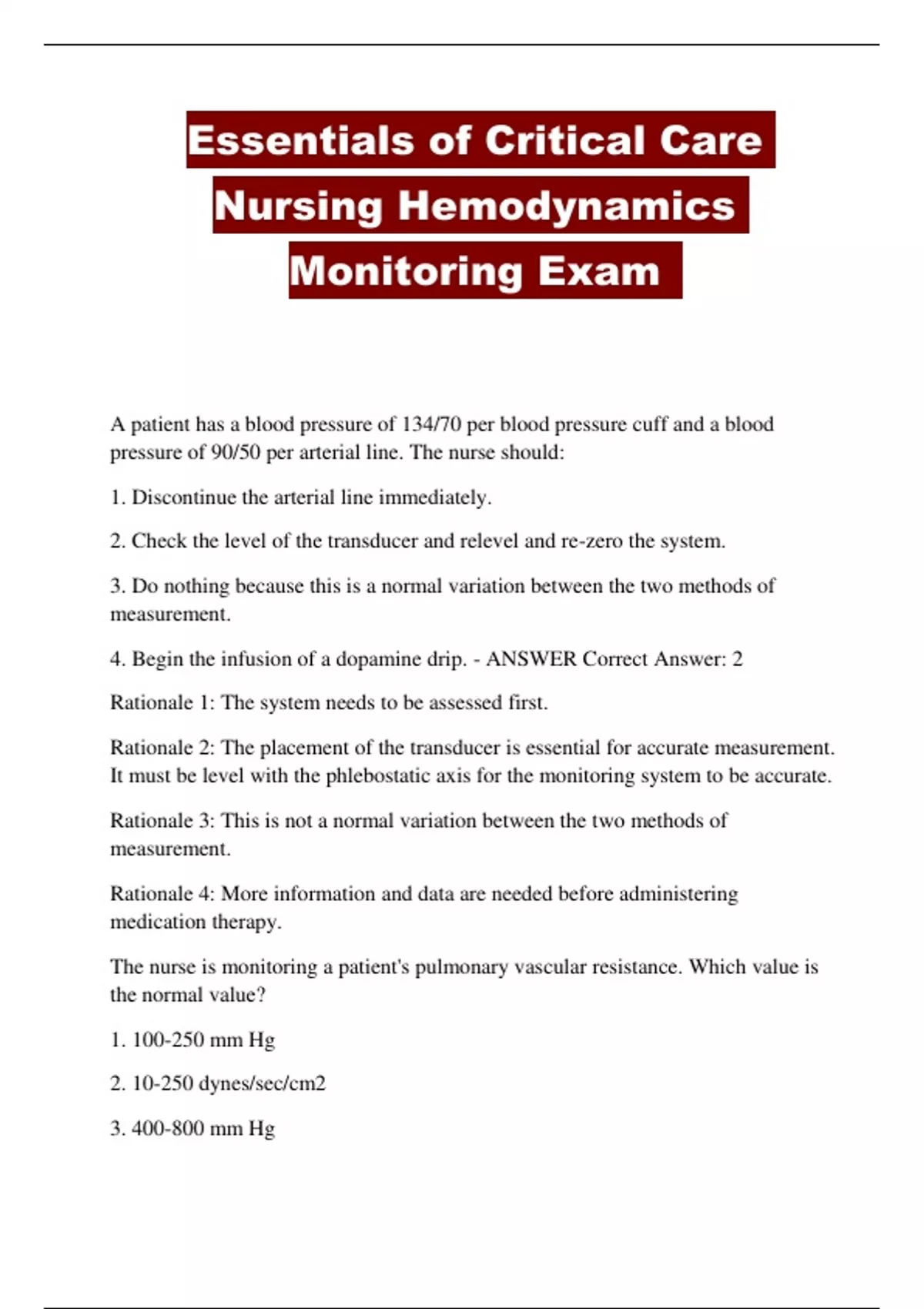 4. Begin the infusion of a dopamine drip. - ANSWER Correct Answer: 2