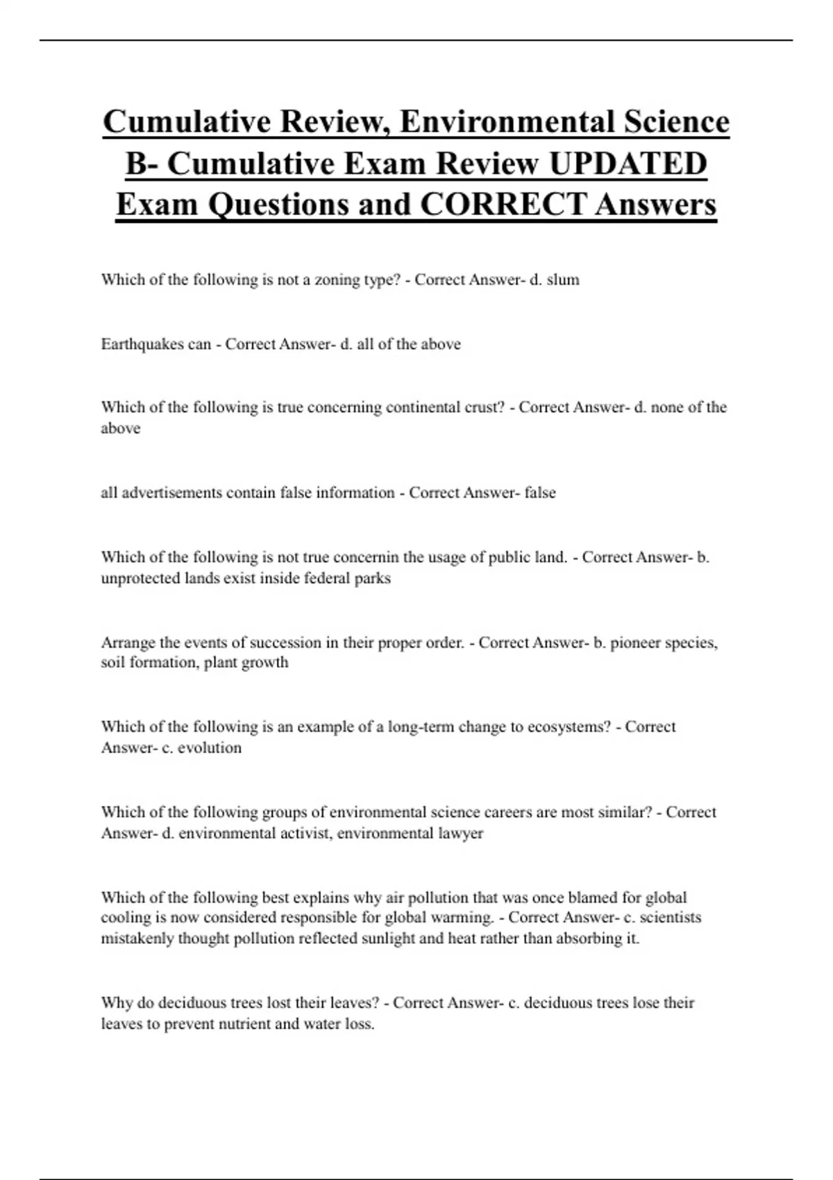 Cumulative Review, Environmental Science B- Cumulative Exam Review UPDATED Exam Questions and CORRECT Answers Which of the following is not a zoning type? - Correct Answer- d. slum Earthquakes can - Correct Answer- d. all of the above Which of the following is true concerning continental crust? - Correct Answer- d. none of the above all advertisements contain false information - Correct Answer- false