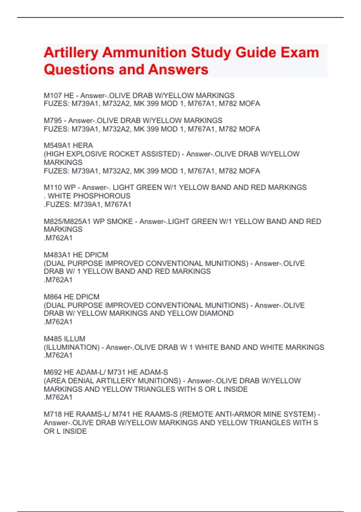 M107 HE - Answer-.OLIVE DRAB W/YELLOW MARKINGS FUZES: M739A1, M732A2, MK 399 MOD 1, M767A1, M782 MOFA M795 - Answer-.OLIVE DRAB W/YELLOW MARKINGS FUZES: M739A1, M732A2, MK 399 MOD 1, M767A1, M782 MOFA M549A1 HERA (HIGH EXPLOSIVE ROCKET ASSISTED) - Answer-.OLIVE DRAB W/YELLOW MARKINGS FUZES: M739A1, M732A2, MK 399 MOD 1, M767A1, M782 MOFA M110 WP - Answer-. LIGHT GREEN W/1 YELLOW BAND AND RED MARKINGS . WHITE PHOSPHOROUS .FUZES: M739A1, M767A1 M825/M825A1 WP SMOKE - Answer-.LIGHT GREEN W/1 YELLOW BAND AND RED MARKINGS .M762A1 M483A1 HE DPICM (DUAL PURPOSE IMPROVED CONVENTIONAL MUNITIONS) - Answer-.OLIVE DRAB W/ 1 YELLOW BAND AND RED MARKINGS .M762A1 M864 HE DPICM (DUAL PURPOSE IMPROVED CONVENTIONAL MUNITIONS) - Answer-.OLIVE DRAB W/ YELLOW MARKINGS AND YELLOW DIAMOND .M762A1 M485 ILLUM (ILLUMINATION) - Answer-.OLIVE DRAB W 1 WHITE BAND AND WHITE MARKINGS .M762A1 M692 HE ADAM-L/ M731 HE ADAM-S (AREA DENIAL ARTILLERY MUNITIONS) - Answer-.OLIVE DRAB W/YELLOW MARKINGS AND YELLOW TRIANGLES WITH S OR L INSIDE .M762A1 M718 HE RAAMS-L/ M741 HE RAAMS-S (REMOTE ANTI-ARMOR MINE SYSTEM) - Answer-.OLIVE DRAB W/YELLOW MARKINGS AND YELLOW TRIANGLES WITH S OR L INSIDE