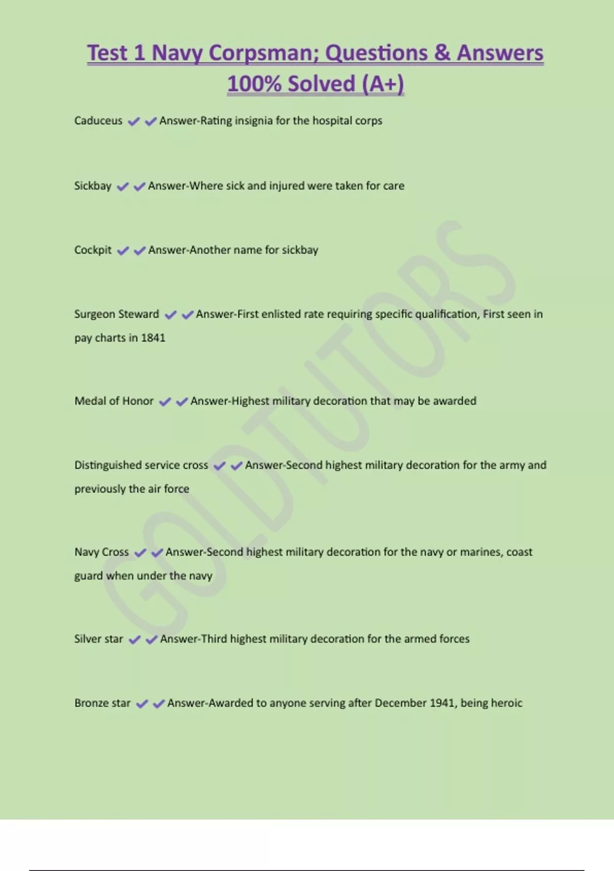 Test 1 Navy Corpsman; Questions & Answers 100% Solved (A+) Caduceus Answer-Rating insignia for the hospital corps Sickbay Answer-Where sick and injured were taken for care Cockpit Answer-Another name for sickbay Surgeon Steward Answer-First enlisted rate requiring specific qualification, First seen in pay charts in 1841 Medal of Honor Answer-Highest military decoration that may be awarded Distinguished service cross Answer-Second highest military decoration for the army and previously the air force